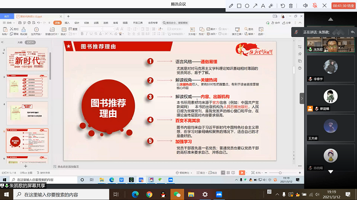 2021年3月12日晚6点,污污漫画 本科生党支部通过“腾讯会议”在线上成功举办领读讲座。本次讲座由支部书记廖晨曦主持,96名支部内党员、预备党员和积极分子参加,同时,本次讲座还有幸邀请到了污污漫画 分党委副书记王瑞敏老师、马克思主义学院博士生冯楠楠师姐和朱凯歌师兄分别对《被讨厌的勇气》、《共产党宣言》和《新时代热词》进行领读。 “读书会”是本科生党支部的一项特色传统活动,旨在以读书打卡、讨论交流等方式督促支部内的同志们进行理论学习。本期“读书会”共有《被讨厌的勇气》、《共产党宣言》、《新时代热词》三本书供支部里的同志们进行选择,在“读书会”正式开始前,支委们特别邀请到三位老师或师兄师姐来为大家进行领读,以激发大家的阅读积极性,促进大家更好地理解所阅读的书目。 首先,王瑞敏老师对《被讨厌的勇气》进行领读。老师谈到了该书的主要内容、重要观点、推荐原因等多个方面,使大家对该书有了初步的认识。“《被讨厌的勇气》主要介绍了阿德勒心理学的一些思想,由日本人岸见一郎和古贺史健合著。采用哲人和青年人对话的形式,通俗易懂。读完之后可以帮助解决大学生面临的常见困扰,比如自卑、人际关系、生涯发展、家长期待和内心想法不一致时该如何抉择、恋爱与工作的关系等等。” 之后,冯楠楠师姐对《共产党宣言》进行领读。师姐主要从推荐原因、伟人的评价、主要内容、阅读方法等方面对该书做了详细的讲解。“我们不仅要读一些通俗类的读物,也应当读一些经典的原著。因为我们走进经典的过程,才是不断地去触摸到经典中的理论和真理的一个过程。《共产党宣言》在马克思主义思想形成史、自主发展史、无产阶级运动史、中国特色社会主义建设史上都有着巨大的意义和价值。” 最后,朱凯歌师兄对《新时代热词》进行领读。师兄也是从推荐原因、主要内容、阅读方法、预计收获等方面向大家进行了介绍。“该书以习近平新时代中国特色社会主义思想中蕴含的党中央重大决策部署的思想精髓和核心要义为重点把握方向,精选了120个代表性的‘热词’,分别追寻其出处,解析其内涵和政策建议,搜集与其相关的信息化素材,总结而成。” 在每位老师或师兄师姐领读结束后,均留有时间供大家进行提问。相信在一个半小时的领读和答疑过程中,支部内的同志们都对三本书有了初步的了解。感谢三位老师或师兄师姐的分享,也期待支部内的各位同志在接下来的“读书会”中能“读有所乐、学有所获”。 污污漫画 本科生党支部 供图供稿:李春宇 |