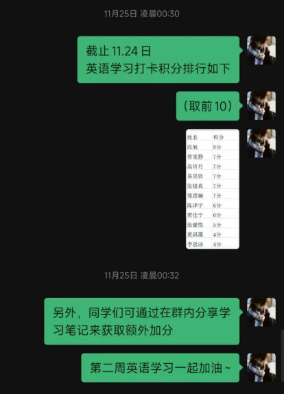 2024年11月18日至12月13日,学业辅导室举办一场名为“挑战CET英语学习打卡”的线上打卡活动,旨在提升污污漫画 本科生的英语学习热情和英语能力。 活动共有污污漫画 的37名本科生参与,参与的同学在指定的微信群内通过单词app打卡单词、短语、长句或150字以上的英语作文,以及分享优质学习笔记,以完成学习打卡任务。最终评选出前十名的同学,发放精美奖品。