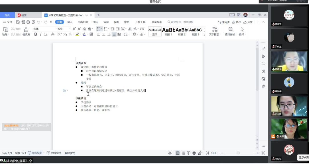 2022年8月28日晚,为了尽快地带领新生安全、顺利渡过新生适应期,帮助2022级学长导师了解工作内容、提高工作能力,协助好班主任做好新生开学的系列繁杂工作、做好关键的入学教育,由黄利老师策划并指导的新生学长导师培训在腾讯会议举行,2022级新晋级的6位学长导师窦佳宁、李佼佼、宋佳忆、刘文婧、马嘉晨、何菁淼参与学习,2021级学长导师陆靖仪、罗晓慧、魏铱楠、连阳宇、赵萃交流分享经验。 首先,学长导师们介绍自己所属年级和任职班级,让大家迅速进入状态并打破尴尬。自我介绍结束后,2021级学长导师依次分享工作经验和内容,并提出相应建议。如对宿舍分配工作、班会组织工作细节的介绍。在分享结束后,2022级学长导师根据今年学生实际情况提出问题,如“本次学长导师均为师姐,是否存在一些工作不便的情况,可以如何解决”等,黄老师和2021级学长导师都给与了详细解答,帮助新生导师解决了相应的顾虑,释放了压力。