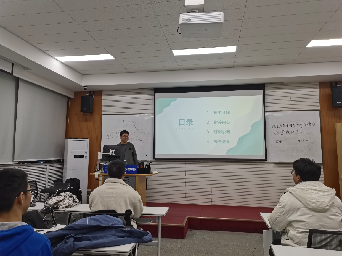 首先,班主任,学长导师分别向理科实验班的同学介绍自己,班委也向同学介绍自己的职务和工作内容。此外,班长向理科实验班的同学介绍了进入励耘班后的衔接内容。 接下来,班长为同学们介绍了有关综测的内容,使同学们更深的了解了有关学业评价的内容。 最后,王乾东老师为同学们进行安全教育,提醒同学们在校内的一些安全注意事项。