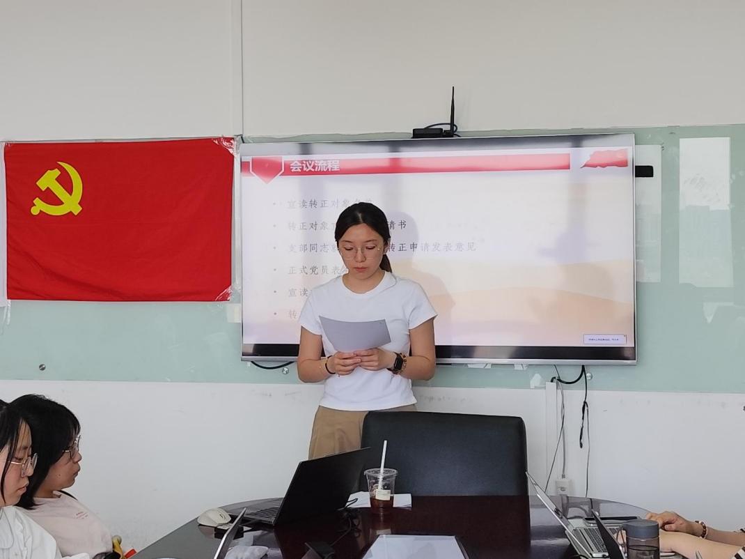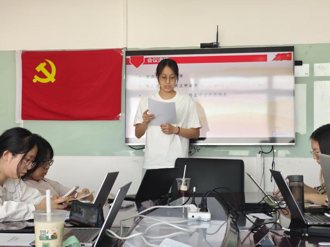 在民主讨论与评议环节,孙梓耀同志认为刘千荻同志作为班长是师弟师妹们学习的楷模,在教学过程中也践行着用实践检验真理的原则,达到正式党员标准。罗珏同志也表示刘千荻同志对于班级工作非常尽职尽责,能够帮助同学们解决实际的问题。黄彤彤同志补充刘千荻同志在科研方面不畏艰难,努力在学习和实践中不断提升自己。 党支部全体正式党员进行无记名投票,结果为11票赞成,0票反对,0票弃权。经讨论,支部大会通过了刘千荻同志的转正申请,同意其按期转正为中国共产党党员。 刘千荻同志发表转正感言,表明自己未来将继续努力工作学习,全心全意为人民办好实事。 接下来,杨若彤同志宣读了《转正申请书》。预备期间,她思想上不断深入学习党的理论知识,参加党组织活动,内化理念,践行党的价值观;学习上集中于专业实践与实习,提升专业素养,积极参加学术讲座和专业培训,拓宽知识面;生活中以身作则传递正能量,投身志愿服务,参与公益活动,践行党的宗旨。杨若彤同志过去一年在思想、学习、生活等方面取得进步,更加坚定成为正式党员的决心。