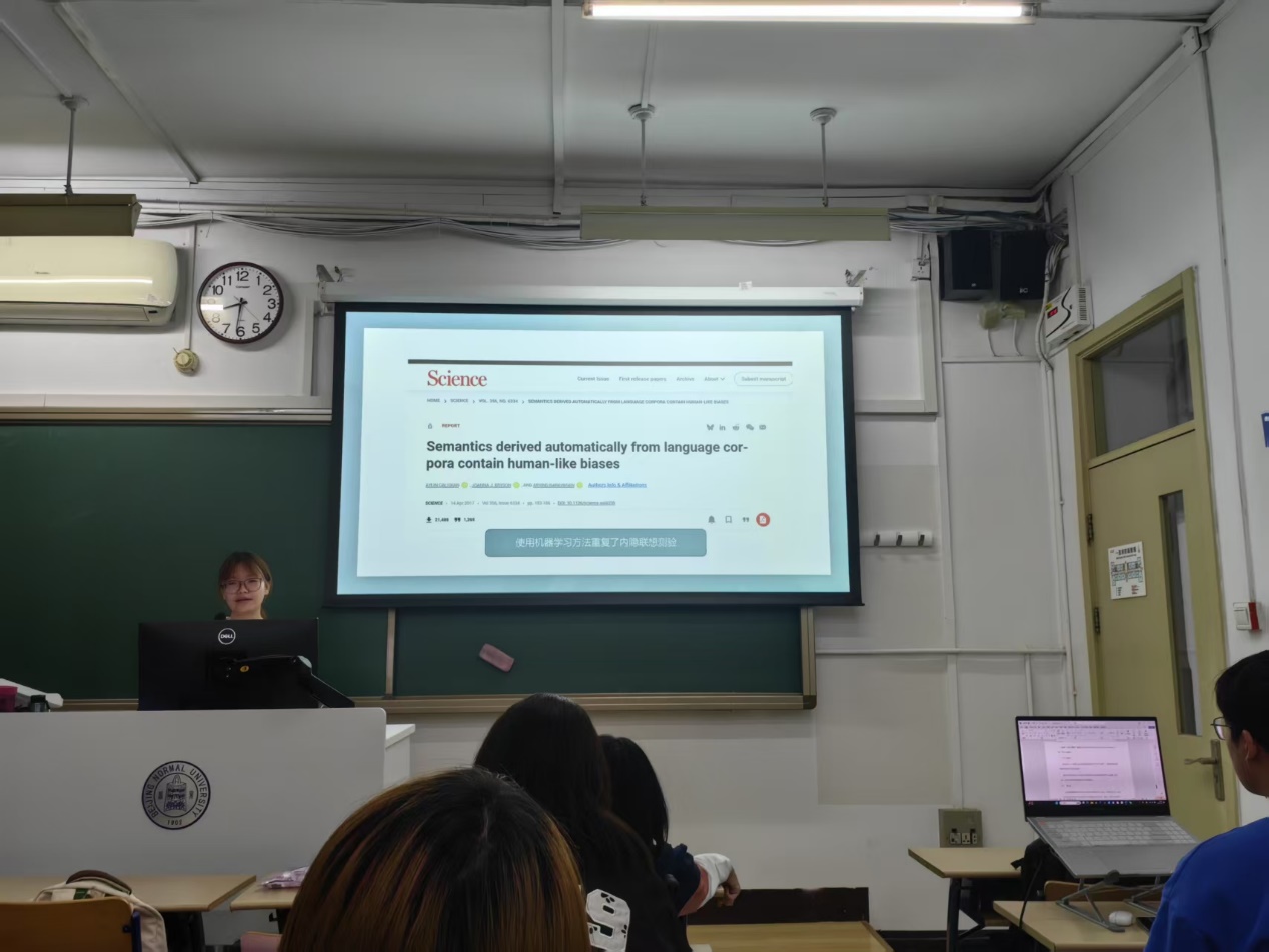 随后,孙聪慧同学结合自己在李琦老师研究组的学习经历,分享了使用微博文本爬虫技术进行睡眠风险监测的技术开发过程,并介绍了一篇相关领域的研究论文,重点指出机器学习模型在处理信息时能够学习到人类的内隐偏好,并在测试中呈现出与人类相似的内隐联想现象,引发了在场同学们的浓厚兴趣与思考。