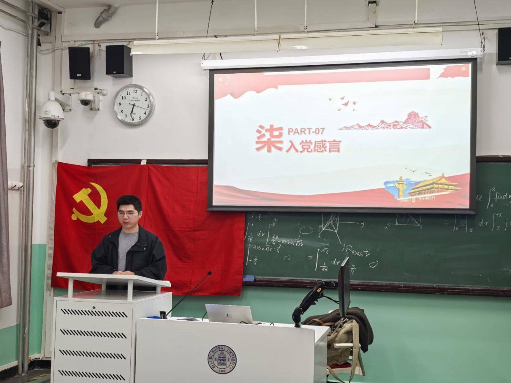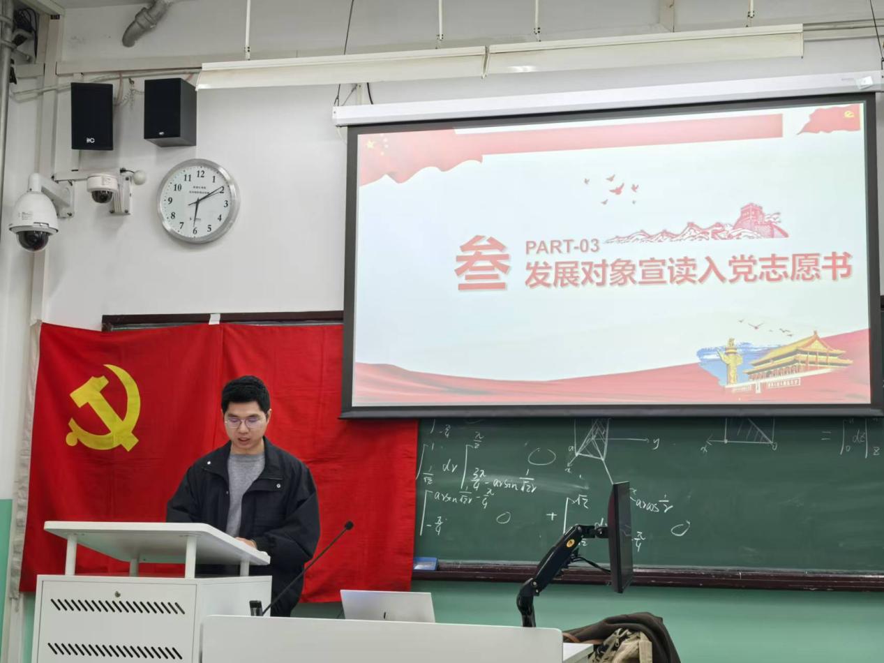 接着,李金文同志宣读入党志愿书。李金文同志自提交入党申请以来,始终以党员标准严格要求自己,在思想行动上努力向党组织靠拢。在思想方面,他认真学习党的基本知识,不断提高对党的认识和理解,端正入党动机;在学习方面,他刻苦学习专业知识,潜心钻研科研问题,取得了一定的研究成果;在生活中,李金文同志的思想作风良好,工作认真负责,积极参与班级和支部活动,投身社会实践。特向党组织提出申请,转为中共预备党员。
