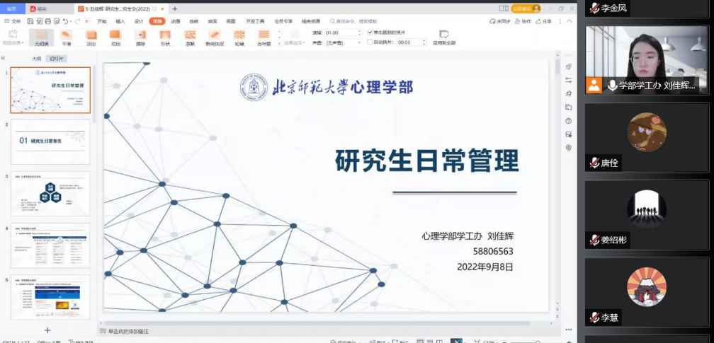 2022年9月7日,污污漫画 污污漫画 2022级学术硕博士研究生入学教育在线上顺利举行。污污漫画 副部长骆方老师,党委副书记史佳鑫老师,外事办公室项目主管崔艳丽老师,实验中心实验员谷沛嫱老师,学生工作办公室刘佳辉老师、杨宗茂老师、孙杨柳老师、李昕益老师,教务办公室秘书刘虹雨老师出席了本次活动。2022级学硕2班、2022级博士2班全体参会。本次入学教育由刘佳辉老师主持。