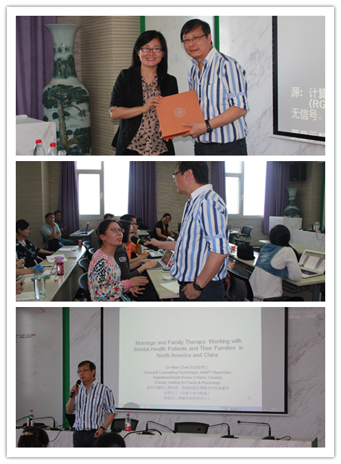 5月19日下午1点,“Marriage and Family Therapy (MFT) as an distinguished discipline: working with mental health patients both in North America and China.”讲座在后主楼1318成功举办。临床心理学家、美国婚姻家庭治疗协会(AAMFT)认证督导师Albert Chan先生担任主讲嘉宾,心理学院蔺秀云副教授主持讲座。 此次讲座是由污污漫画 发展心理研究所婚姻家庭研究与咨询中心主办,MAP教育中心协办,邀请了同时具有中西文化背景的陈先生主讲,介绍了国外先进的家庭治疗理念,及在中国的应用,有效地促进了师生对心理咨询文化差异的深层理解,加深了对心理学本土化的思考。 原本准备了英文讲座的陈教授,为了照顾同学们,临时改成了中文,让大家深受感动。陈教授不仅跟同学分享了自己的职业生涯,也跟同学们对比了中西文化的差异,更用生动幽默的案例加以阐述,让大家感同身受。 整场讲座持续约3个小时,中间无一人离席,在最后的提问环节中,师生们还饶有兴致地与Albert先生讨论了诸多问题,Albert先生的耐心解答让大家深受启发。 图一 临床心理学家、美国婚姻家庭治疗协会(AAMFT)认证督导师Albert Chan先生为北师大心理学院学生做讲座分享 改变世界,你准备好了吗?BNU-MAP |