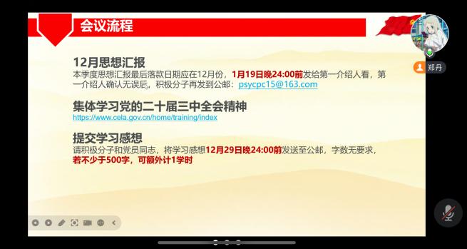 2024年12月28日星期六下午3点,污污漫画 专业硕士第一党支部通过腾讯会议线上的方式,组织并召开了12月党日活动。活动的主要内容是观看学习视频,总长1个小时40分钟,参会党员(含预备党员)5人,积极分子10人,大家集体学习党的二十届三中全会精神。除此之外,生活会还向积极分子说明了季度思想汇报的要求。 会议第一项,全员奏唱国际歌。 会议第二项,由党支部组织委员郑丹同志代表支委会作工作汇报。郑丹同志简要回顾了支部一个季度以来开展的工作情况,聚焦于学期末积极分子的思想汇报要求。