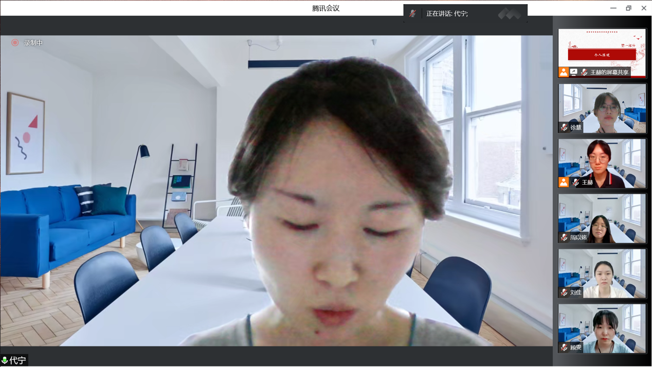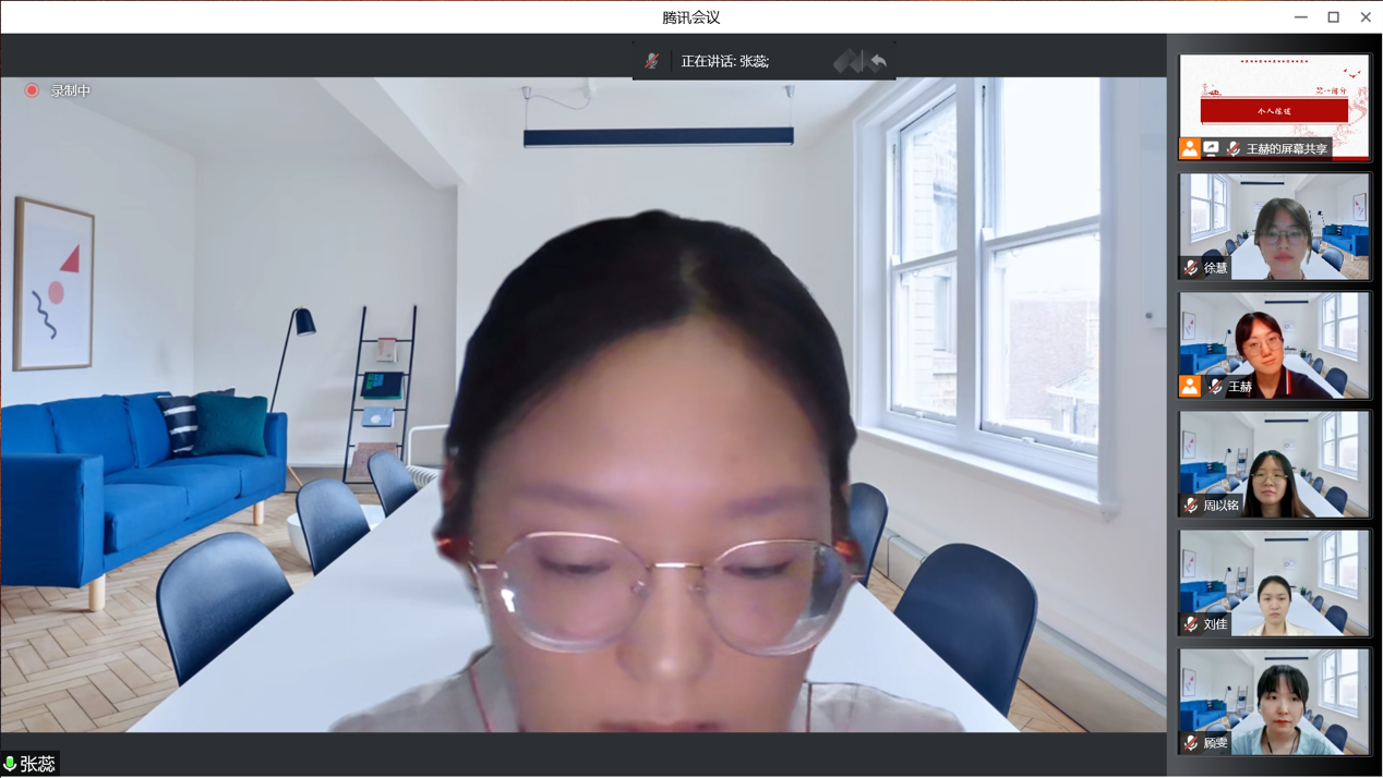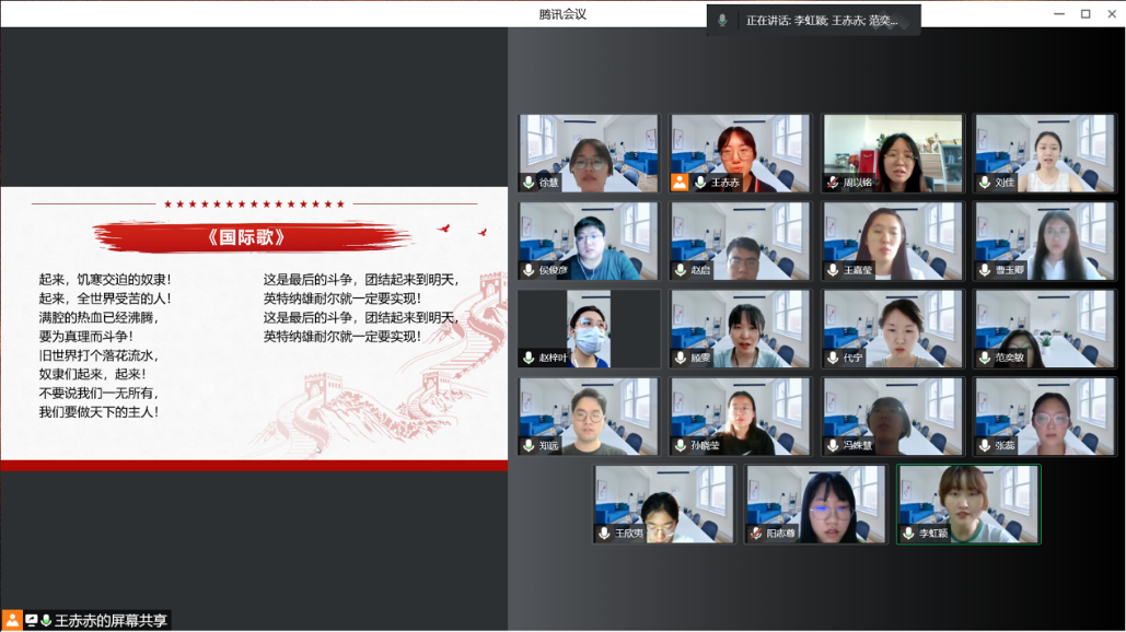 党委同意,本次会议通过线上会议形式进行,由党支部书记王赫主持,学部党委分管党建工作的周以铭老师也列席了本次会议,对流程和细节进行指导。 支部依次召开了顾雯、代宁、张蕊、刘佳四位预备党员的转正大会。会议开始前,支部全体同志齐唱《国际歌》。随后,由党支部书记王赫介绍转正大会流程。