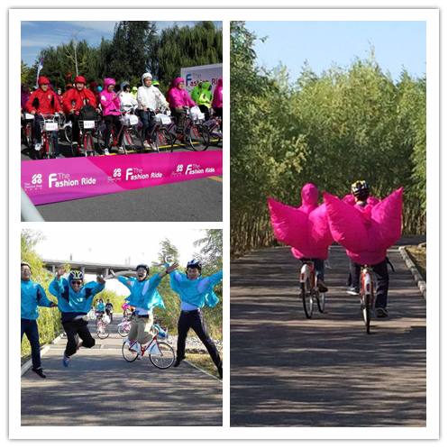 在The Fashion Ride北京站的活动中,最吸引人眼球的莫过于“骑行服”:每位活动的参与者都可以在拿到的装备包内获得一件趣味骑行服,而这些骑行服共有49种不同造型及颜色。在骑行区内,数千人的彩色骑行服方阵一时间化成了秋日中一幅别样的景色。9:30,骑行活动准时开始。心理学院校友们分别领取了骑行自行车,开启了园博园骑行之旅。大家边骑行,边欣赏美丽的风景。骑行过程中,活动主办方通过趣味活动向公众提倡“骑行”这种健康绿色、低碳环保的出行新方式。