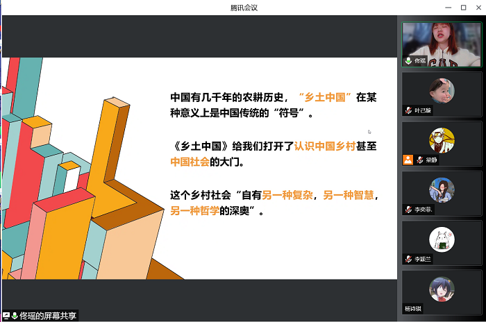 最后,佟瑶师姐对《乡土中国》进行领读。师姐从费孝通先生决心弃医从文、研究社会、疗治社会疾病的生平讲起, 向我们介绍了《乡土中国》对中国传统农耕文明的符号意义。最后,师姐引用清华大学邱勇校长在新生赠书中的寄语“植根家国热土,砥砺成长担当”勉励支部内的同志,愿《乡土中国》也能打动我们、帮助我们认识中国乡村甚至中国社会的深奥哲学。