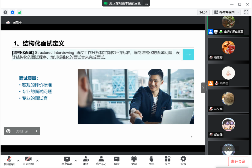 接下来,李妍老师为同学们简要介绍了一下结构化面试,包括定义、流程和问题类型和回答技巧。李妍老师还为大家总结了压力化面试通关四步:应聘准备、自我认知、心理建设、表达能力。