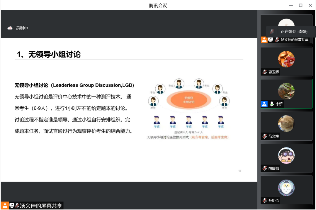 接下来,李妍老师为大家介绍了无领导小组讨论,包括流程、题本类型、通关技巧等信息,希望大家能够克服无领导小组讨论的不良情绪,正视求职竞争。