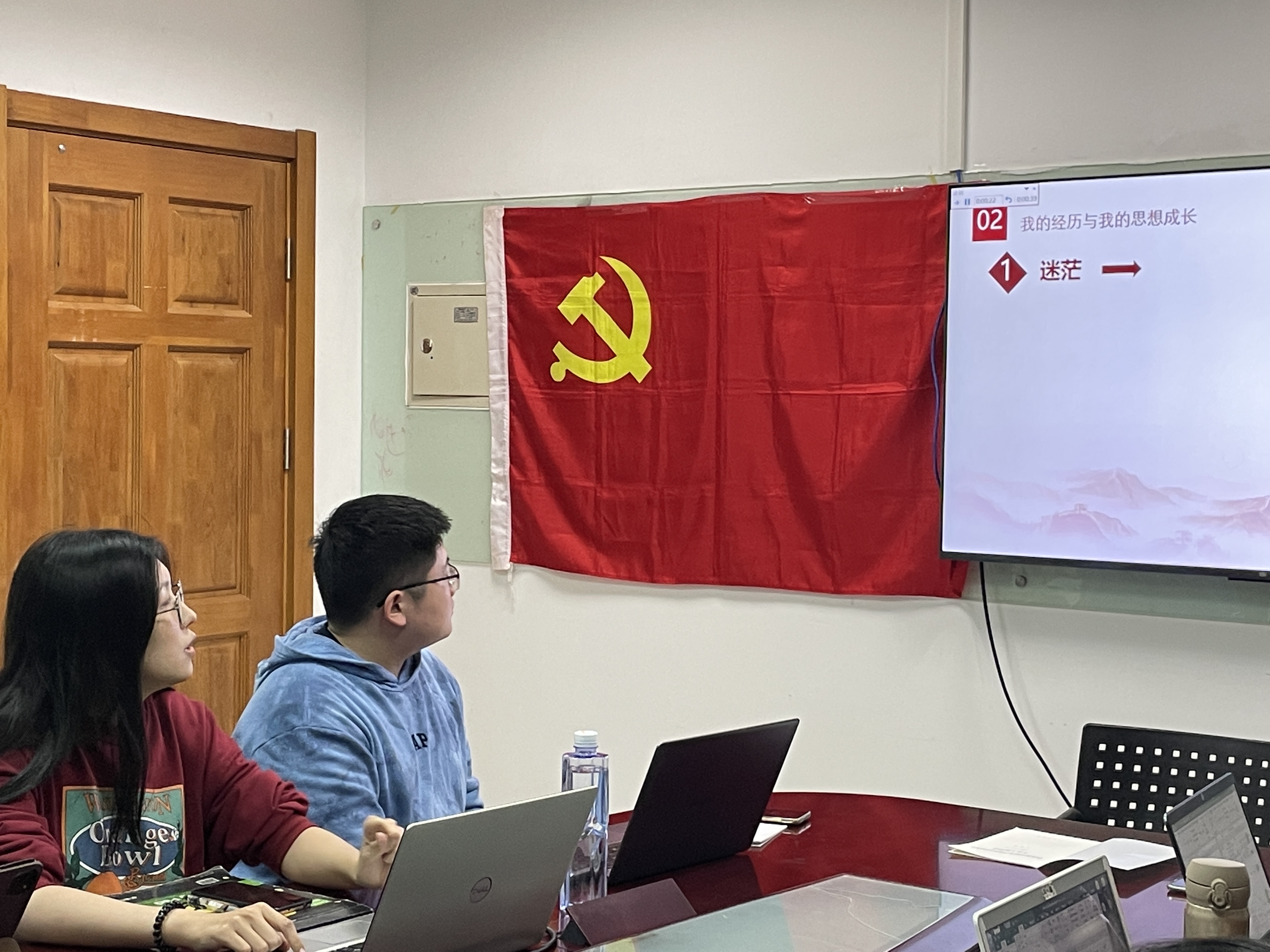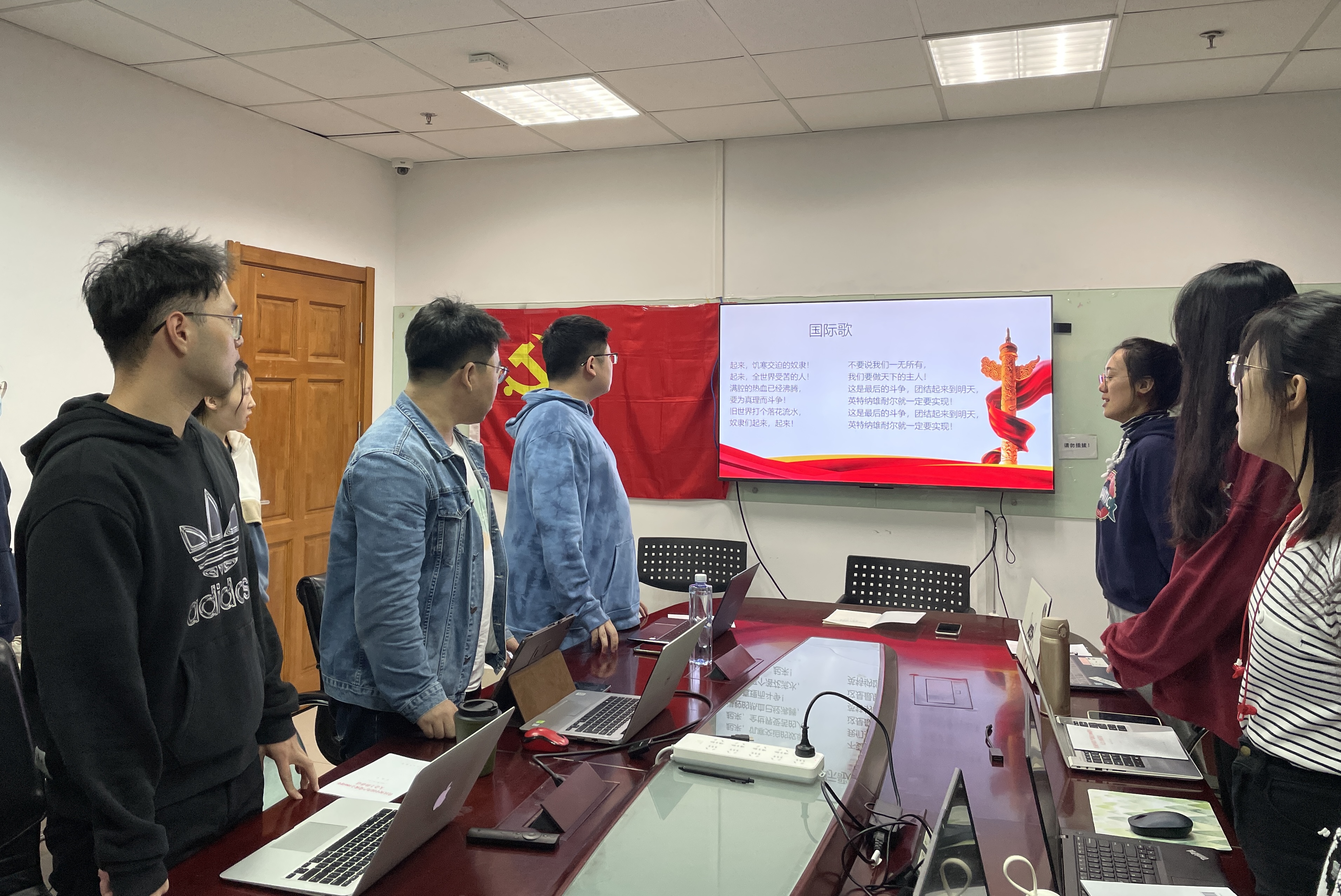 2021年10月10日晚六点,污污漫画 研究生第四党支部的支部成员们准时到达会议室,准备召开本学期第一次党支部会议。 正式会议开始前,全体党员起立,合唱《国际歌》。