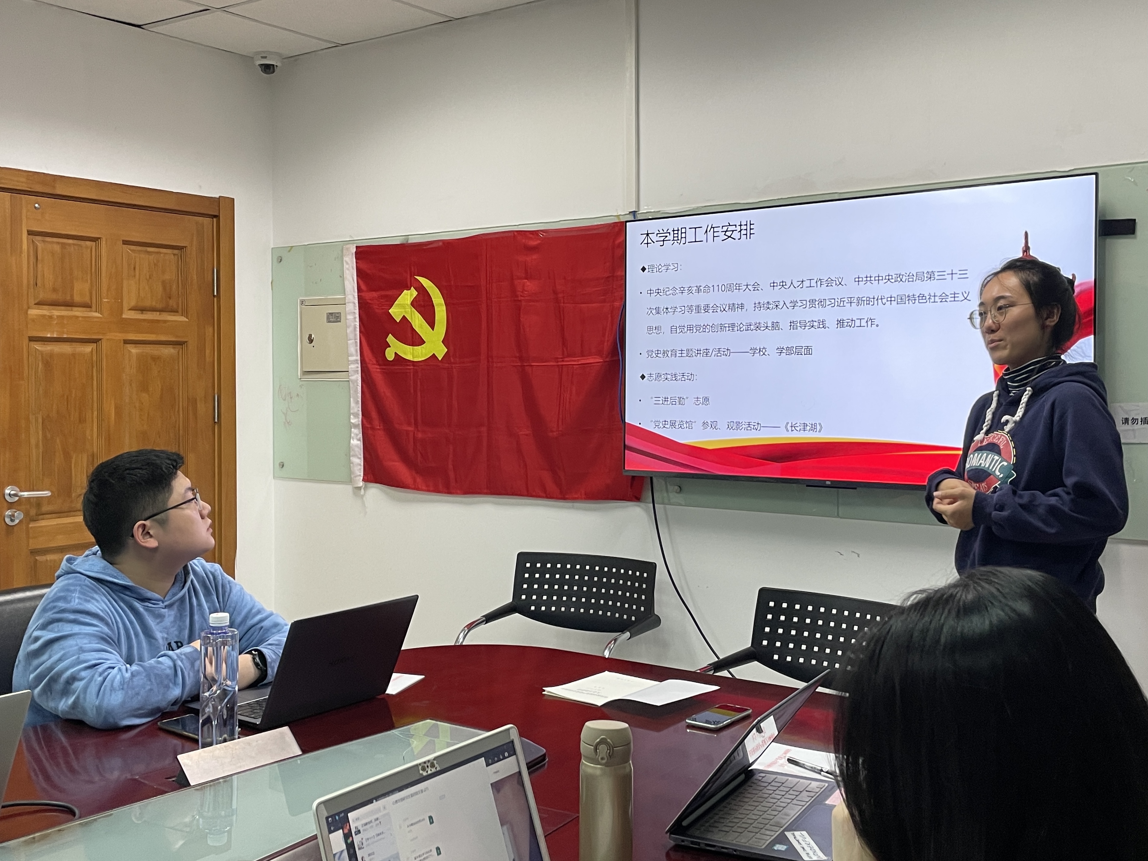本学期第一次党支部大会正式开始 会议开始后,支部书记重点从理论学习和志愿实践活动两个方面介绍了本学期的工作计划,同时就党员发展工作的推进情况做了简单说明。线上、线下,理论、实践相结合的学习活动安排获得了大家的一致好评。
