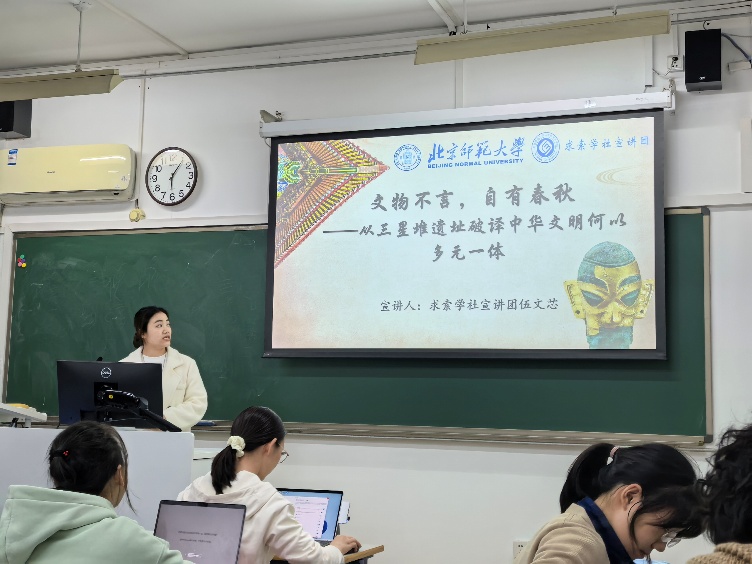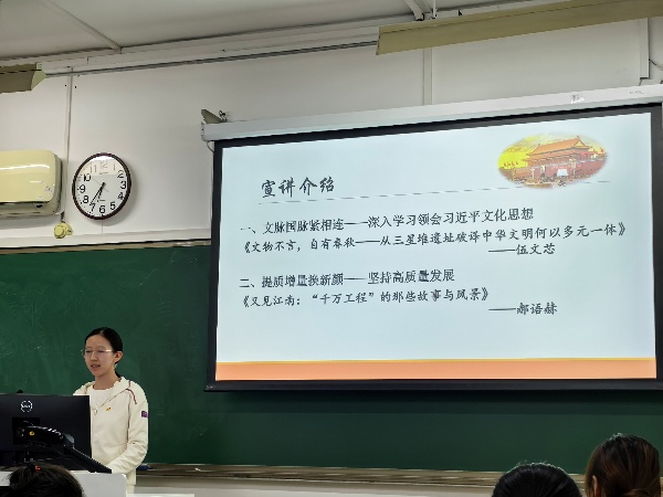 接着,求索学社宣讲团的伍文芯学姐为同学们带来了名为《文物不言,自有春秋——从三星堆遗址破译中华文明何以多元一体》的主题宣讲,从三星堆发掘和保护情况、著名文物概况、神话传说体系等方面,充分介绍了三星堆遗址及其背后反映出的中华文明多元一体特征。文化自信自强是实现中华民族伟大复兴的强大精神力量,此次宣讲增进了同学们对于习近平文化思想的认识,也激发了民族自豪感和自信心。