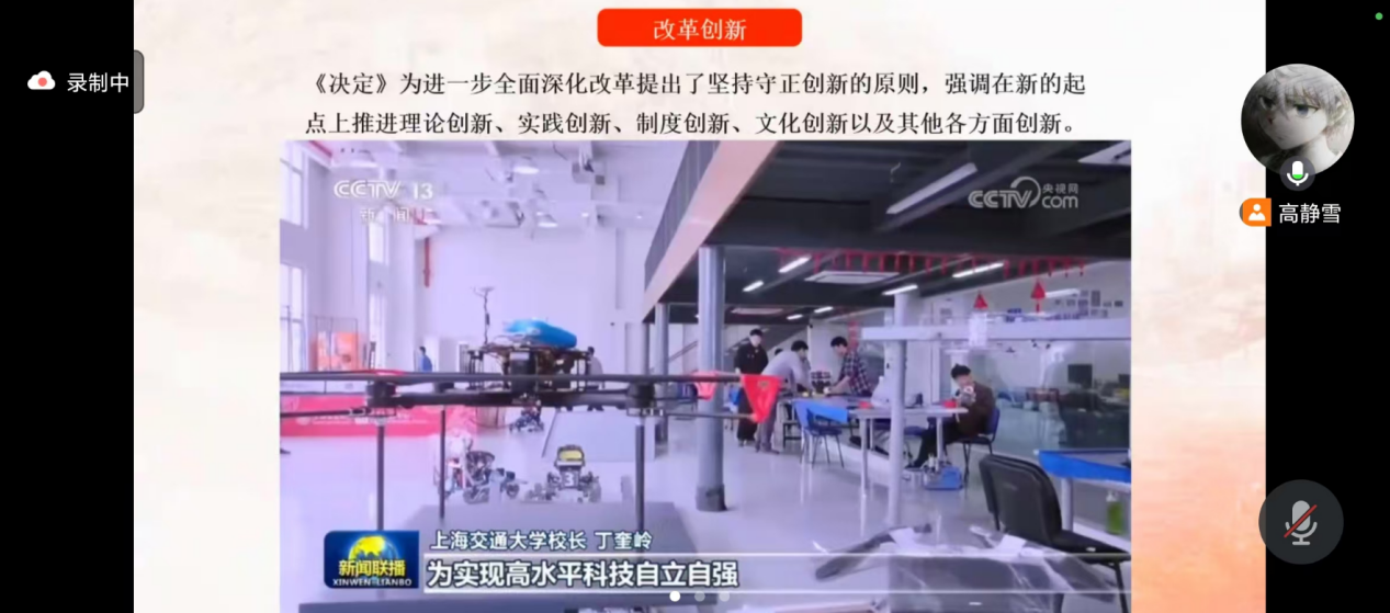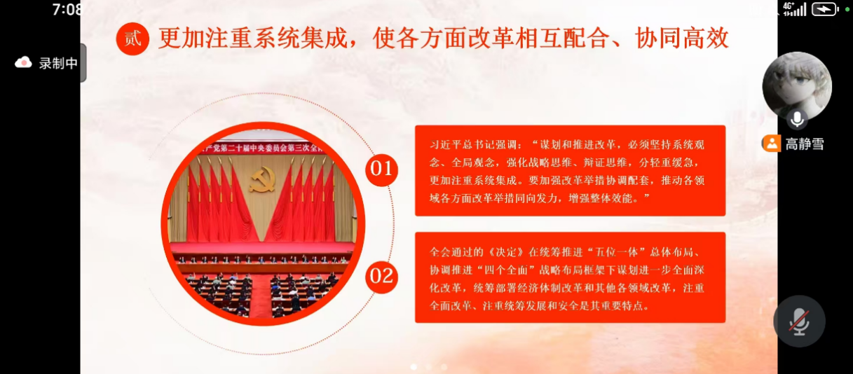 接下来,团支书带领同学们站在党和国家事业发展全局眺望,深入系统的学习全会精神蕴含的深意。通过引用分析习总书记在全会上的发言和《决定》里的语录,团支书深入系统的阐述了:改革更加注重系统集成,更加注重实效,发挥经济体制改革牵引作用,坚持人民至上谋划和推进改革。