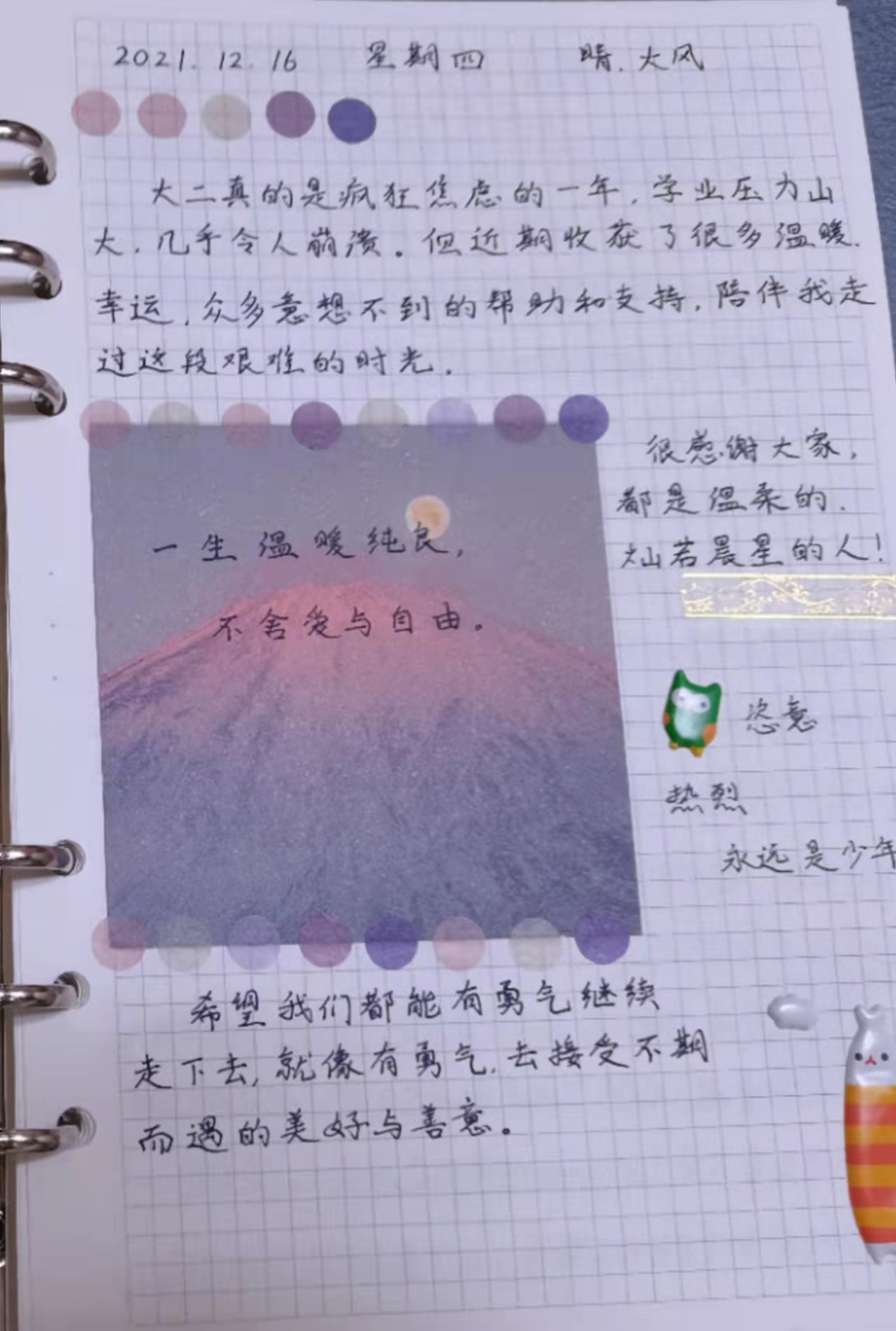 为加强心理建设在班级精神文明建设中的作用,通过集体活动的形式提升学生的心理素质水平,突出班级活动的“心理”特色,污污漫画 2020级本科2班于2021年12月-2022年3月举办了“2班的心灵漂流日记”活动。 活动通过让大家共同创建一本日记本,每个人都在上面留下属于自己的一页美好回忆来增进班级内部同学间的联结和了解交流,增强班级凝聚力,让心与心之间的距离更近。大学生活如此匆匆,通过这个活动可以留下宝贵的班级集体回忆。同时,这次活动也能让大家把平时没有机会表达出的自己的感受或者希望分享给大家的事情以一种书信的方式间接表达,避免了当面表达可能存在的尴尬,是一个很好的契机。 活动开始后,漂流日记将在每个宿舍停留两日,期间同学们在这本日记本中留下自己的一页内容,可以是心情,可以是想法,可以是吐槽,可以绘画,可以做手帐.....按照自己的想法与创意去完成这一页的内容。同时,也看看别人写了什么,留下了什么,如果双方愿意的话,还可以在日记本上进行文字间的互动。