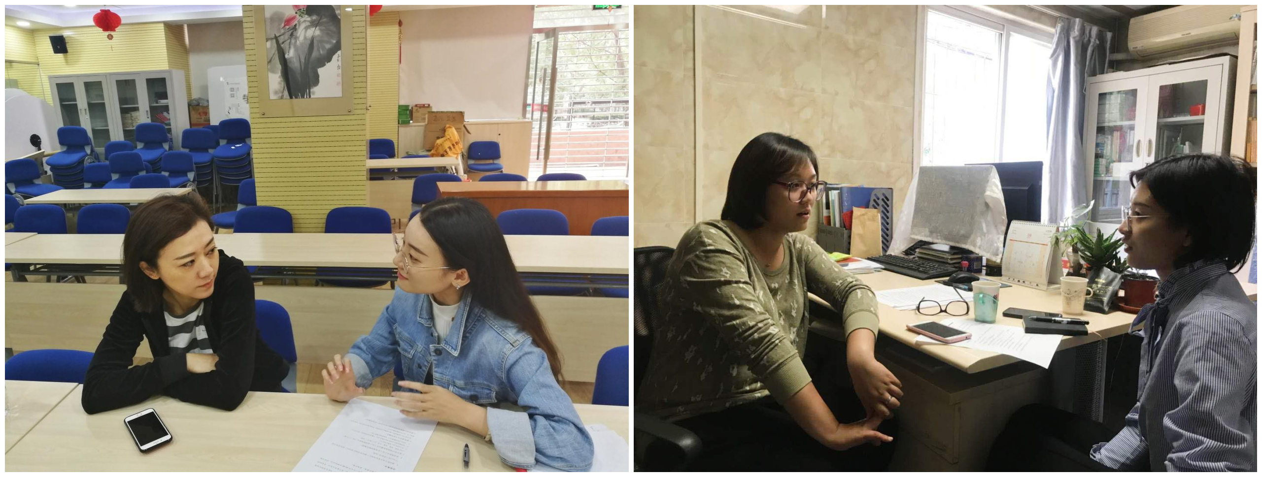 左图为李雪倩在宏汇园社区服务站访谈,右图为徐静在民康社区服务站访谈。