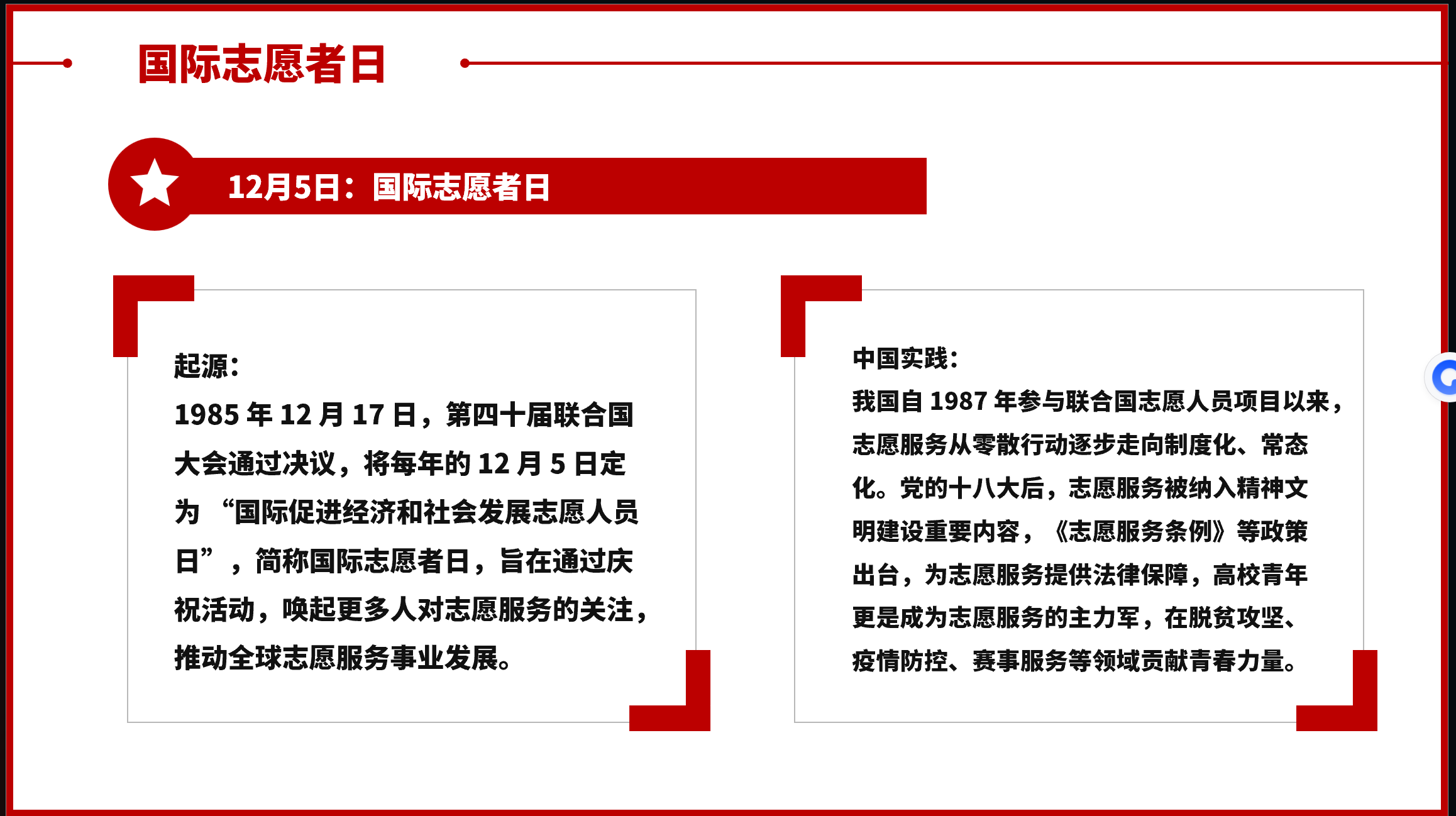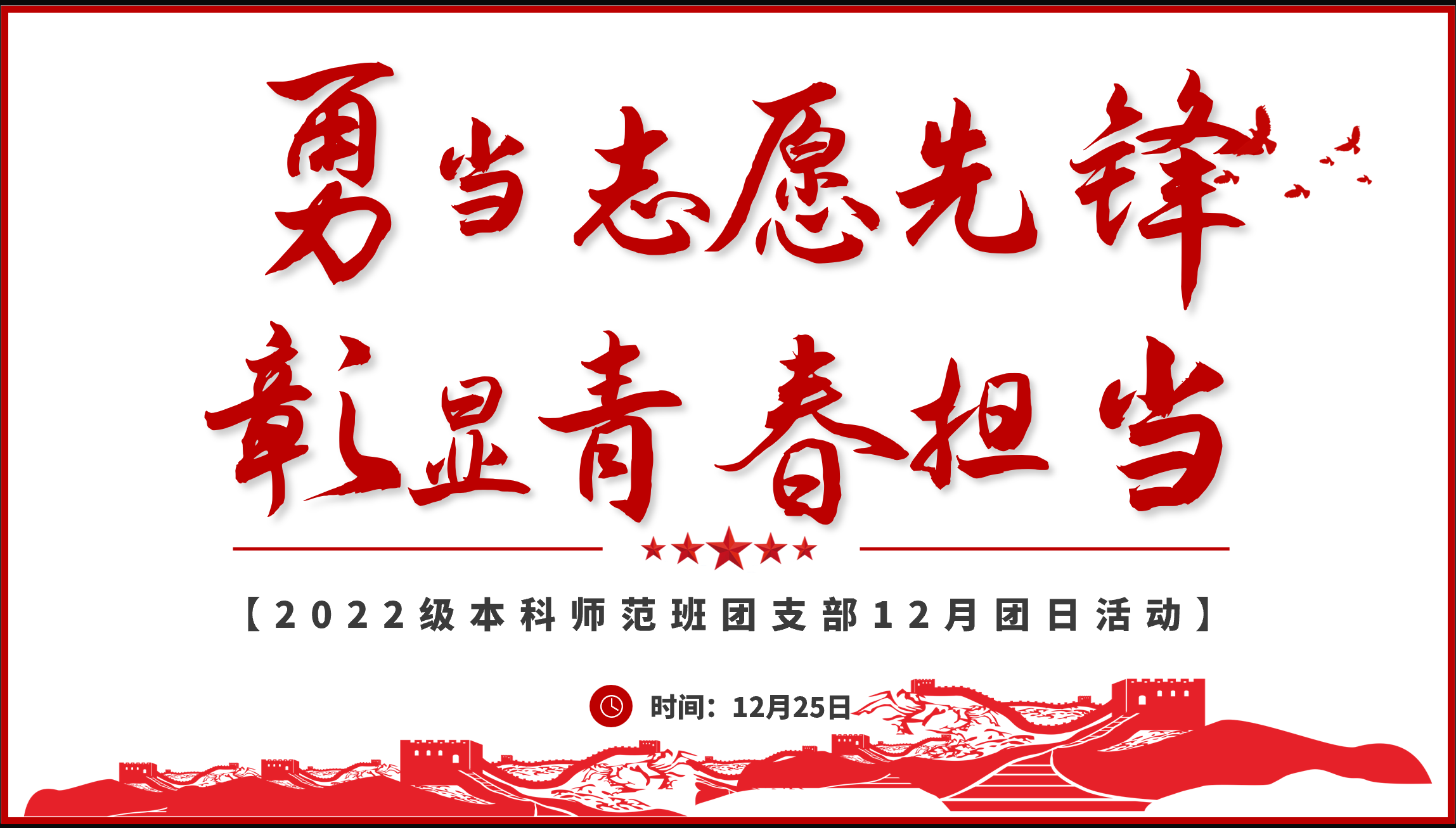 在第40个国际志愿者日来临之际,2022级本科师范班于2025年12月25日以“勇当志愿先锋 彰显青春担当”为主题开展团日活动。