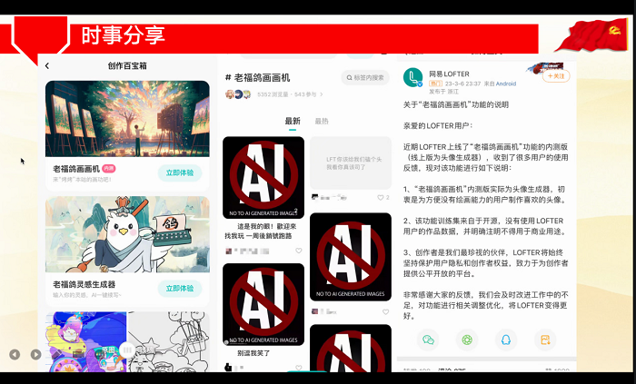 会议由杨子涵同志主持,戚雍雅同志记录,就“新时代发展中的危机与中国方案”这一主题展开时事分享与交流。刘一诺同志首先分享了网易LOFTER“AI绘画”引发争议的相关事件,介绍了事情的起因,对其引发的社会广泛批判与讨论进行具体阐述,引出对“知识产权归属”、“创作者权益”等问题的思考,并紧跟时事,展示了她与Chat GPT对该事件的拓展讨论,帮助我们对该事件有更深入的思考。刘畅同志分享了“美俄亥俄州氯乙烯泄露”事件,首先介绍了该事件的基本情况,并进一步介绍了氯乙烯的危害,批判了美国的不力应对策略,从生态循环的视角表达了对环境污染和当地生存条件的担忧,引出“大国责任”之问,引发大家的思考。倪伊慧同志根据“回答‘现代化之问’的中国方案”这一主题展开论述,详细阐述了习近平总书记关于现代化的思考以及具体的中国方案,带领大家对最新的理论进行学习、思考。在发言讨论环节,各位同志对由时事引出的具体问题展开了积极的交流,分享自己对新时代机遇与挑战的独特看法。
