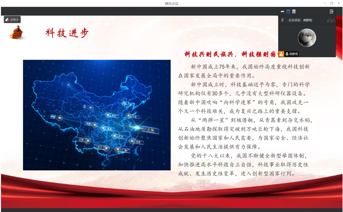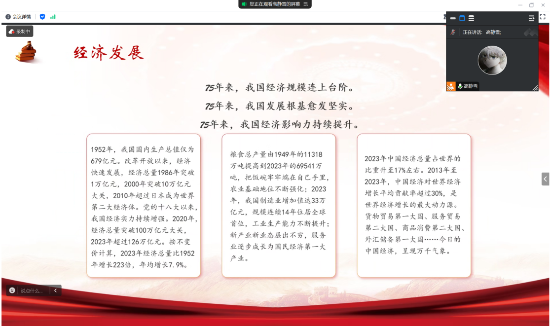 接下来,团支书从经济发展、科技进步、社会民生、国际地位四个角度展示了中国这75年来的辉煌成就。 在经济发展方面,新中国成立75年来,特别是党的十八大以来,中国经济规模连上台阶,经济总量从1952年的679亿元增长到2023年超过126万亿元,年均增长7.9%。这一增长不仅体现在数字上,更体现在人民生活水平的提高和国家实力的增强上。