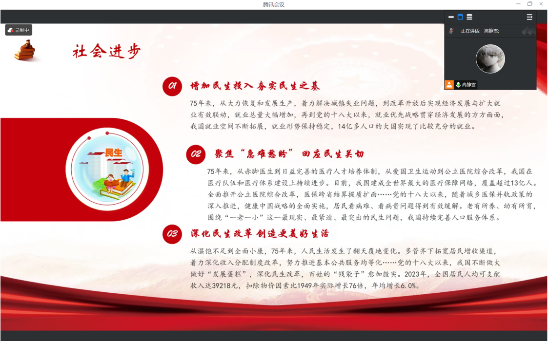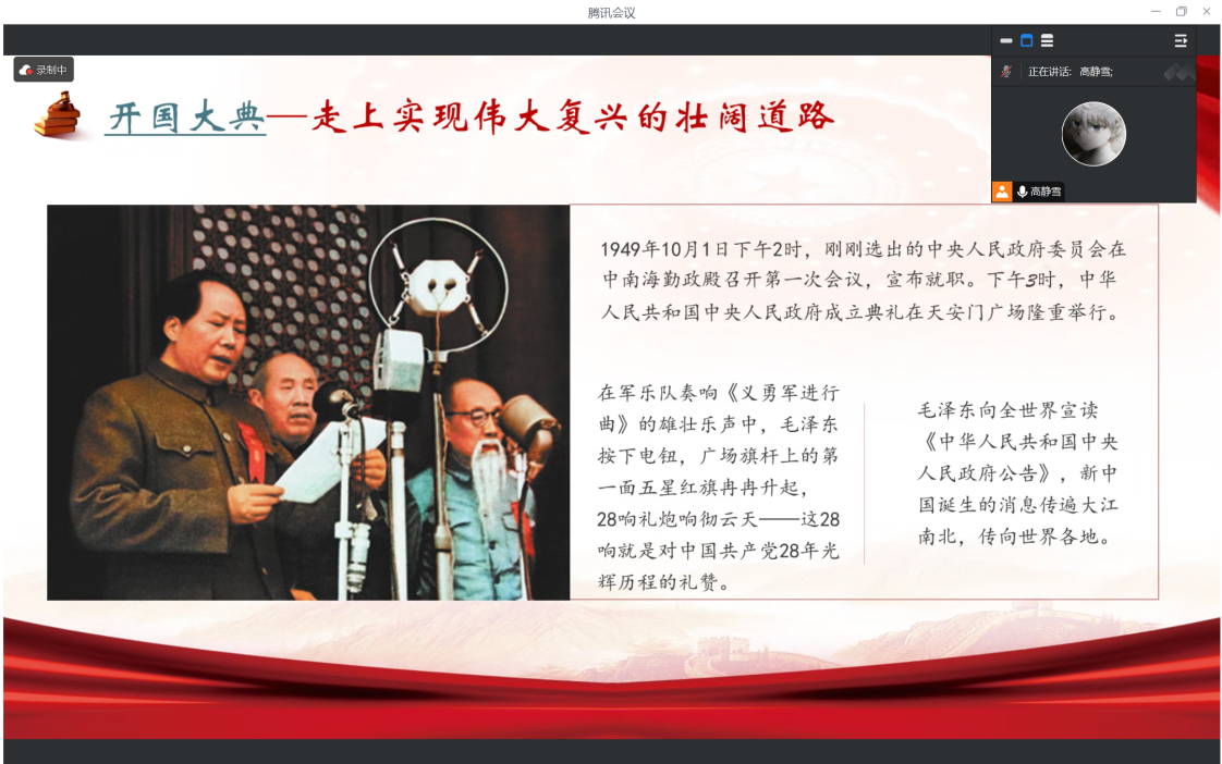 团支书高静雪从中华人民共和国成立的历史背景、75年来的辉煌成就、重要历史节点回顾、当代青年的责任与使命四个方面带领同学们全面学习。 在中华人民共和国成立的历史背景部分中,团支书对进京赶考、中国人民政治协商会议第一届全体会议的召开、开国大典等重要历史时刻进行了简要介绍,回顾了新中国的诞生历程。