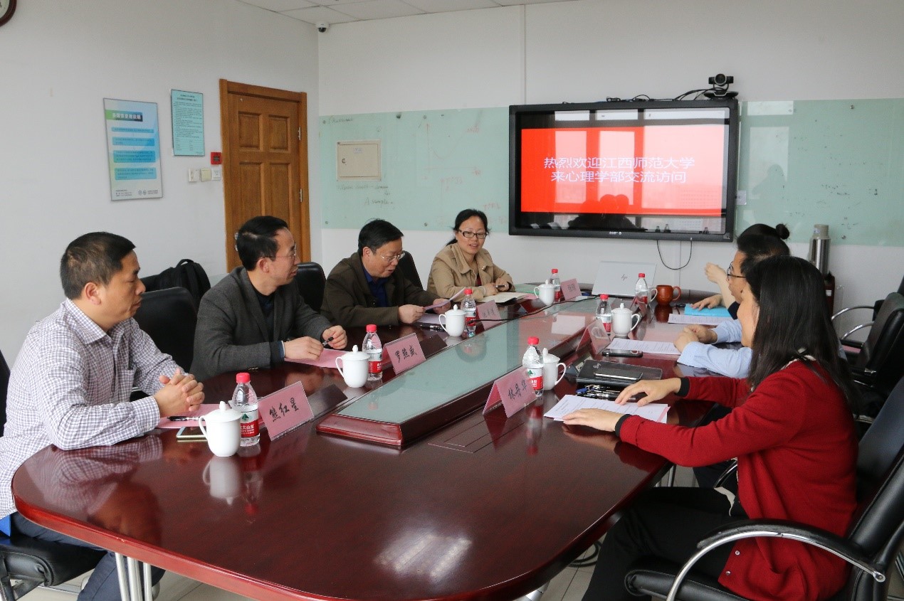 4月19日,江西师范大学心理学院党委书记池平清、院长罗照盛、副院长张璟、副教授熊红星一行来访污污漫画 。我部党委书记乔志宏,副部长林丹华、刘春荣负责接待并与参加座谈。