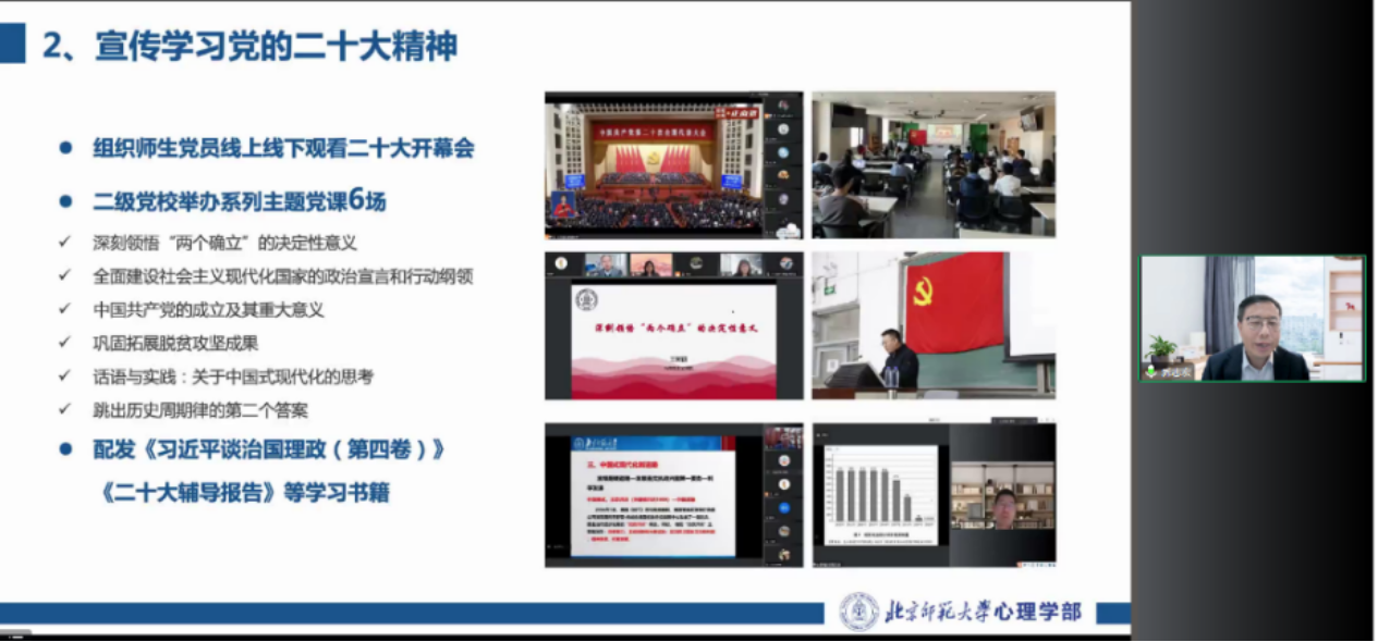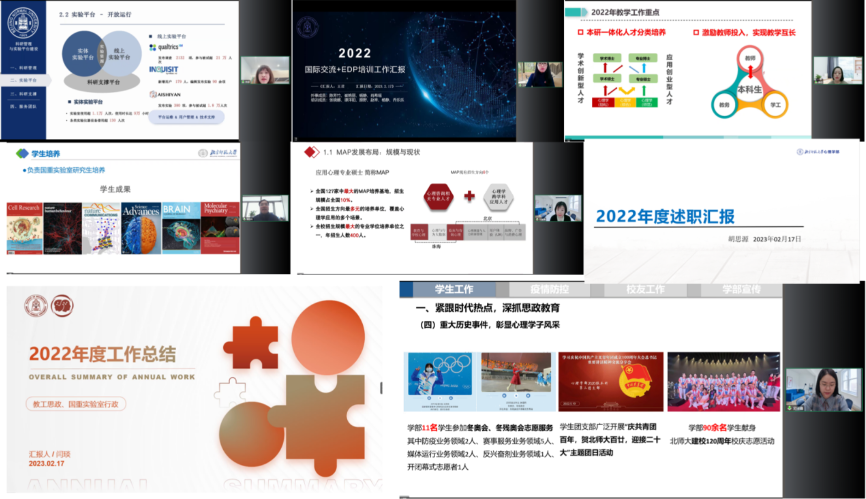 学部党政领导班子成员分别进行了2022年度的述职汇报。部长助理韩卓对学部科研管理和实验平台建设的工作进行了汇报,分享了学部在科研方面的成果,科研成果的数量和质量均有较大幅度提升。副部长王君对学部国际交流成果和EDP中心培训工作进行了汇报,分享了2022年度国际交流成果及EDP中心项目建设成果。副部长骆方对学部本硕博人才培养工作进行了介绍,并详细分享了本研一体化人才分类方案,激励教师投入、实现教学互长的成果。副部长韩在柱对国重实验室研究生和本科人才培养工作进行了汇报,分享了人才培养的成果。副部长刘春荣对专硕MAP人才培养和双创中心的工作进行了介绍,强调高投入带来强品牌。其中的“高质量应用心理专业硕士培养模式创新与实践”获评北京市高等教育教学成果特等奖,是我校唯一获评特等奖成果。副部长胡思源汇报了学部综合行政管理和财务管理工作成果及2023年度的工作计划和重点。副书记闫琰汇报了学部教工思政和国重行政管理工作的成果;副书记史佳鑫从学生工作、疫情防控、校友工作和学部宣传等方面进行了总结。