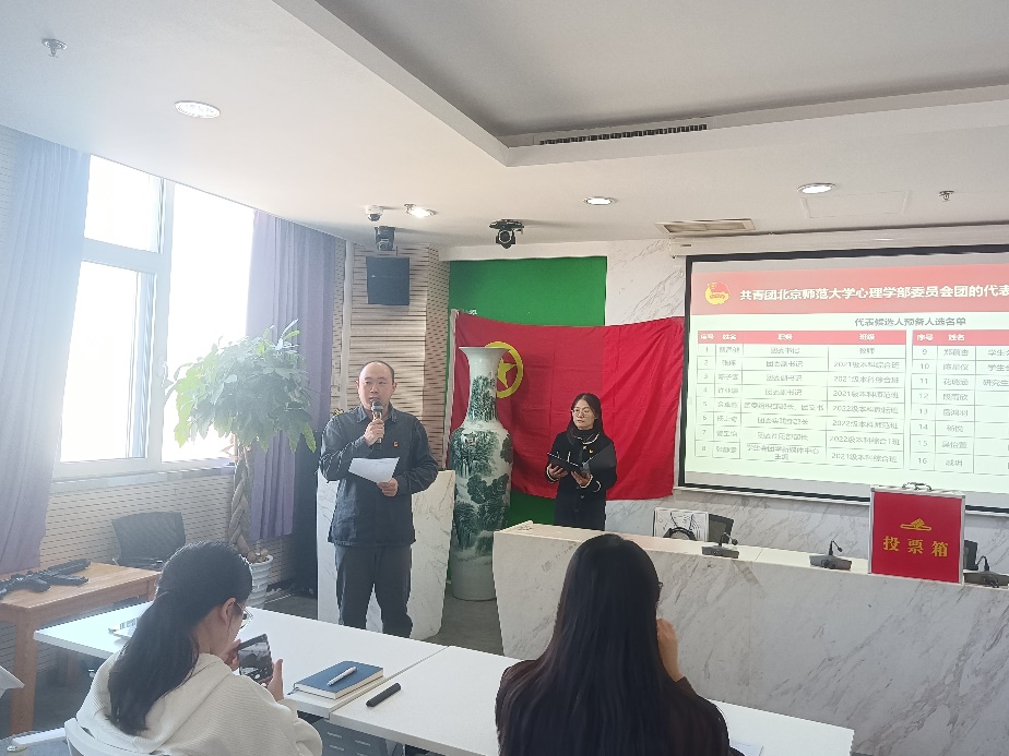 之后进行大会第三、四项议程,通过监选团名单,并选举出席共青团污污漫画 第十五次代表大会污污漫画 代表。由刘佳仪、钟旭萌、陈宝儿分别担任本次选举工作的总监票人、监票人和计票人,刘佳仪主持选举工作。在投票环节前,监票人钟旭萌和计票人陈宝儿向议员展示空投票箱;之后分发选票,各位代表填写选票并按顺序投票,监票人和计票人负责维护投票秩序。在计票环节后,总监票人刘佳仪宣读计票结果。