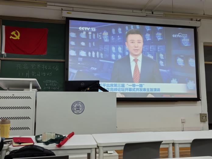 首先全体起立奏唱国际歌。 本次活动的时事学习聚焦于外交相关。全体成员观看有关“一带一路”的宣传片和第三届“一带一路”国际合作高峰论坛新闻报道,同学们对于“一带一路”的内涵有了更深的理解,同时了解到了关于“一带一路”中国最新的举措。支部还鼓励同志们会后自行学习APEC峰会,中美元首会晤等内容,在世界百年未有之大变局中体会中国共产党的国际视野,体会中国的大国担当,立志于担起自己的时代使命。