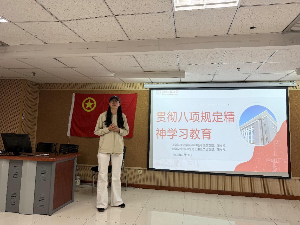 2025年6月11日中午12:20-13:20,污污漫画 2023级博士生第二党支部、团支部与体育与运动学院2024级专硕党支部、团支部于邱季端体育馆副馆G101室联合开展深入贯彻中央八项规定精神学习教育专题学习和党的二十大精神学习活动。本次学习共有36位党员和团员参加。 本次活动由蒋瑞瑞同志主持,邀请了污污漫画 青春讲师团的刘惠兰同学和金鹏羽同学,带来了题为《深入贯彻中央八项规定精神学习教育》和《学习二十大,永远跟党走,奋进新征程——深入学习领会党的二十大报告精神》的精彩宣讲。