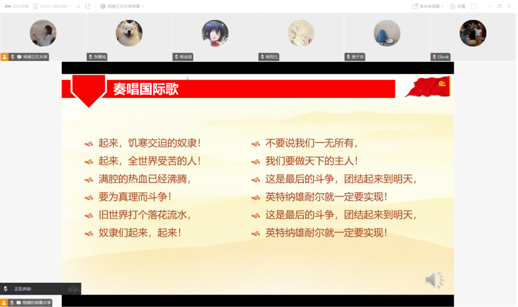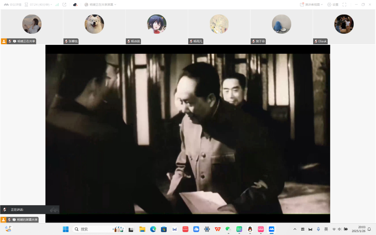【党建】本科生第一党支部1月份主题党日活动顺利开展 2025年1月26日晚8点,本科生党支部1月份主题党日活动通过“腾讯会议”平台以线上会议的形式顺利开展,会议由党支书杨媛同志主持,共43名成员参与。本次会议的主要内容是观看电影《横空出世》。 会议一开始,杨媛同志首先带领所有人一起奏唱了国际歌。