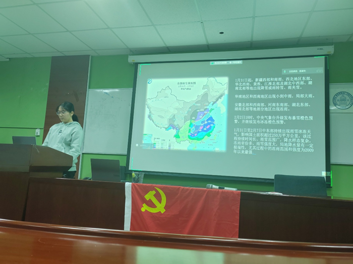 接着,岳泽宇同志以“2月极端天气:南方冻雨”为主题进行了时事播报。她分析了冻雨的成因,并关注到了在客运线路上的那些除冰扫雪的一线工作人员和志愿者,讲述了冰雪之下的温情。