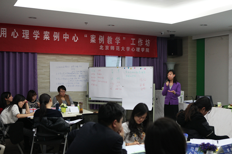在为期两天的工作坊中,李姣博士与各位同仁一起分享了案例方法及作用,以及案例教学的形式与要点。在工作坊一开始,李姣博士就与众位老师分享了哈佛大学成功的案例教学的视频,然大家直观感受了案例教学的课堂,引起了与会者对案例教学的兴趣。随即李姣博士与与会老师一道讨论了案例教学的准备、步骤和教学计划的开发流程。13日下午,李姣博士还邀请到北京航空航天大学教授、“百优”案例获得者武欣老师来分享对案例教学的理解与心得。14日,李姣老师向工作坊学员讲解了案例教学各环节的技巧、演示如何组织课堂,提高学员参与。并用实战演练加穿插讲解,不时安排问答环节,启发大家积极思索、讨论如何将案例教学落实到应用心理专业硕士培养课堂。 图三 武欣老师做客中国应用心理学案例中心首届“案例教学”工作坊 图四 中国应用心理学案例中心首届“案例教学”工作坊参加老师们认真研讨