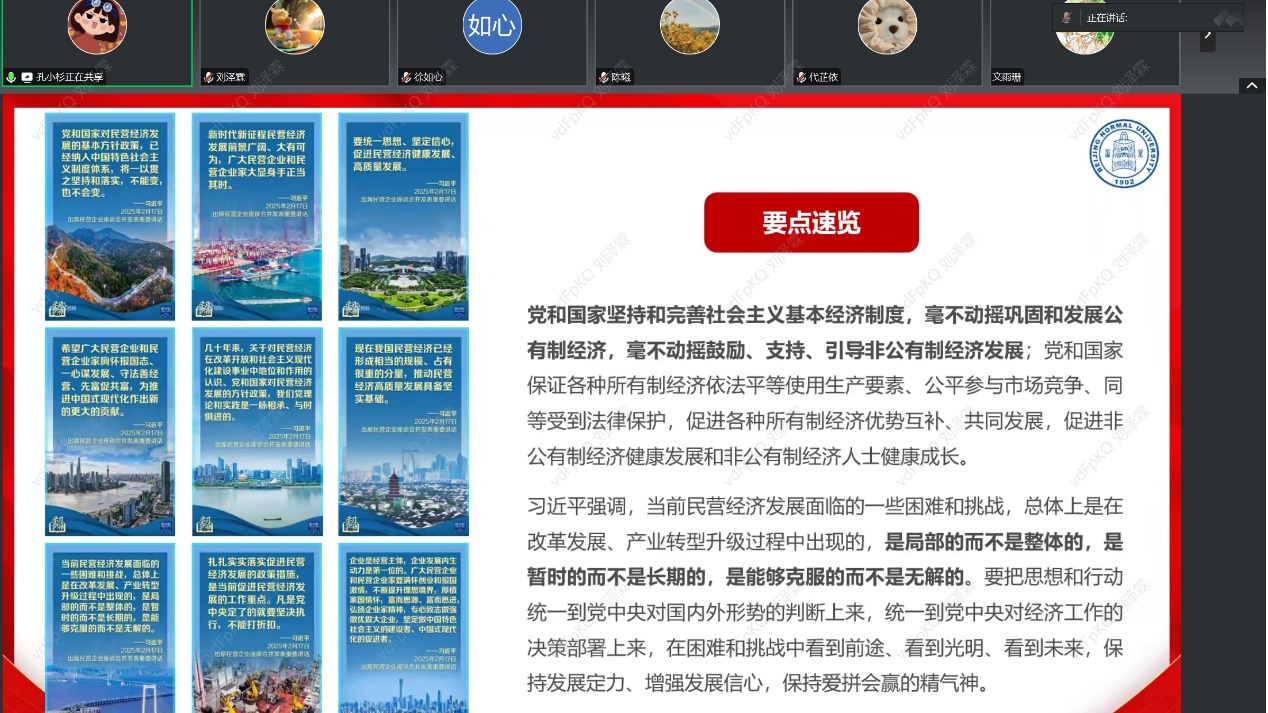 为深入学习贯彻习近平总书记在民营企业座谈会上的重要讲话精神和中央一号文件精神,2025年2月27日21时,污污漫画 2023级学术硕士第二党支部通过线上腾讯会议召开专题党课,组织支部成员共同学习2025年中央一号文件性质及内容,并深入学习民营企业座谈会上的重要讲话精神。本次专题党课由党支部书记孔小杉同志主持,共21名党员和积极分子参与。