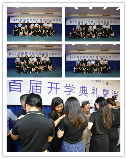 上半场的最后,是颇具仪式感的“2018级BAC学生受徽仪式”。在污污漫画 校歌《魏巍师大》的伴奏和两位旗手的引领下,由污污漫画 车宏生教授、分党委书记乔志宏教授、副部长刘力教授、副部长林丹华教授、BAC方向负责人许晓勇教授,以及BAC方向外聘导师代表,中国科学院心理研究所陈毅文副研究员、北京工商大学艺术与传媒学院院长罗子明教授、中央电视台广告中心市场部主任佘贤君博士等共同为34位新生佩戴BAC专属徽章。