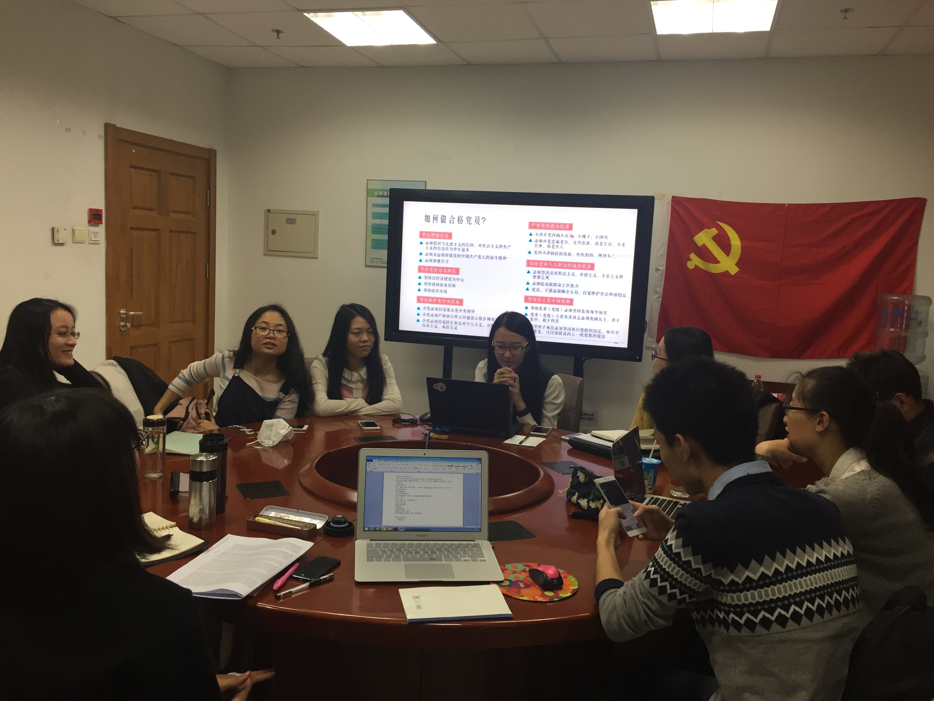 2016年11月7日,心理学院2015级学术硕士党支部关于“合格党员行为规范研讨会”在后主楼1421成功举办。支部成员积极参与,热情讨论,从理想信念、学习实践和生活作风三方面确立了党支部合格党员行为规范。 首先,支部党员在生活委员李维佳的带领下,学习了《关于新形势下党内政治生活的若干准则》、《如何做合格党员》等系列材料,接受了党的新思想和决定,在思想上得到了深化和提升。 图1 生活委员带领党员进行学习 在后续的研讨中,同学们从本支部的实际情况出发,从理想、学习和生活三个层面出发,进行了反思和讨论,现场氛围热烈。大家踊跃发言,就各项内容进行了深入讨论,碰撞出思想的火花,展现了支部党员的风采。 图2 支部党员们正进行热烈的讨论 最终支部全体党员达成一致意见,形成了适合本支部实际情况的合格党员行为规范标准,如:遵守学术道德,恪守学术底线;提升科研能力,争取创新创造等。大家表示在未来的学习实践和生活上,要以支部合格党员行为规范严格要求自己,努力发扬党员的先锋模范作用,做合格党员。 图3支部党员合影