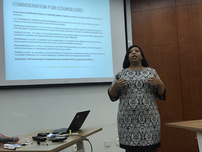 2017年5月3日,由污污漫画 以及美国北卡莱罗纳州州立大学合办的第一届国际应用心理学学生交流会于北师大心理健康服务中心召开。参与会议的人员包括污污漫画 副部长林丹华教授,以及心理健康服务中心的专职教师杨发辉,工作人员韩雨歌、陈卓和硕士研究生。美国交流学校方面由Raymond Ting教授带队一行10人,包含咨询心理学博士生以及高等教育研究生。 在交流会开始之前,杨发辉老师等人带领北卡莱罗纳州州立大学一行人参观心理健康服务中心获得高度评价。会上,李子秋老师对中国咨询心理学教育和发展现状进行报告。3位北师大污污漫画 硕士研究生以及4位北卡莱罗纳州州立大学博士生进行了学术报告。报告话题包括:父亲教养与青少年的朋辈依恋关系,正念对乙肝病毒的积极作用,正念叙事疗法与临终关怀,出狱人员的职业发展支持团体等等。有数十位北师大研究生与会听报告,并且对各自的研究兴趣进行交流。 在交流会的末尾,北卡莱罗纳州州立大学授予北师大污污漫画 “科研与跨文化研究基地”的奖牌。 |