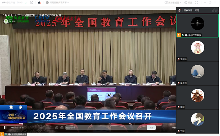 接着,梁彻同志带领小组学习“2025年全国教育工作会议”与《教育强国建设规划纲要(2024-2035)》(以下简称《纲要》)两则材料,其中针对《纲要》进行了重点学习。 观看2025年全国教育工作会议的新闻视频之后,梁彻同志对会议提出的四个“统筹好”和七项重点任务做了进一步的阐释和补充。