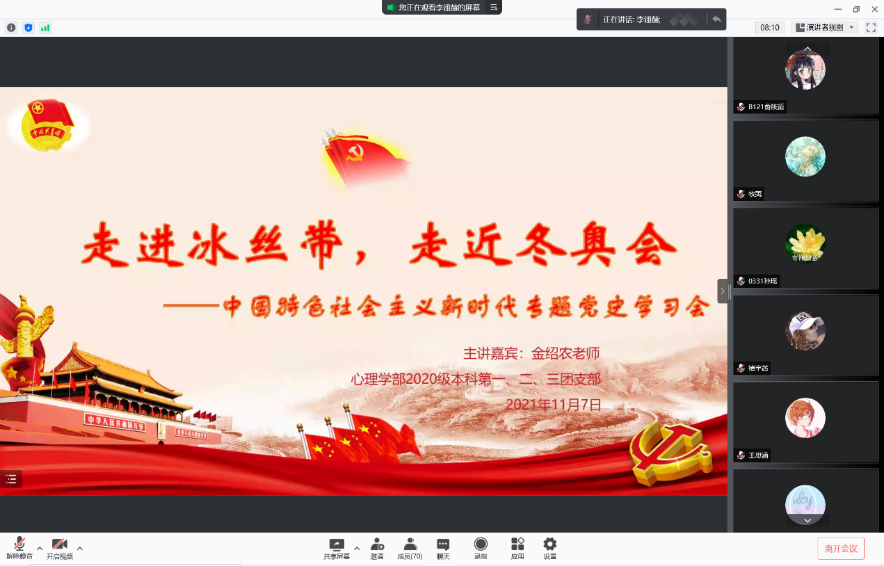 2021年11月7日15:30,污污漫画 2020级本科第一、二、三团支部中国特色社会主义新时代专题党史学习会分享党史学习会在腾讯会议线上顺利召开,会议邀请到了国家速滑馆赛事服务副经理、校团委宣传部长、三班班主任金绍农老师为大家分享冬奥志愿服务的有关工作经历。会议由第三团支部书记李翊赫同学主持。