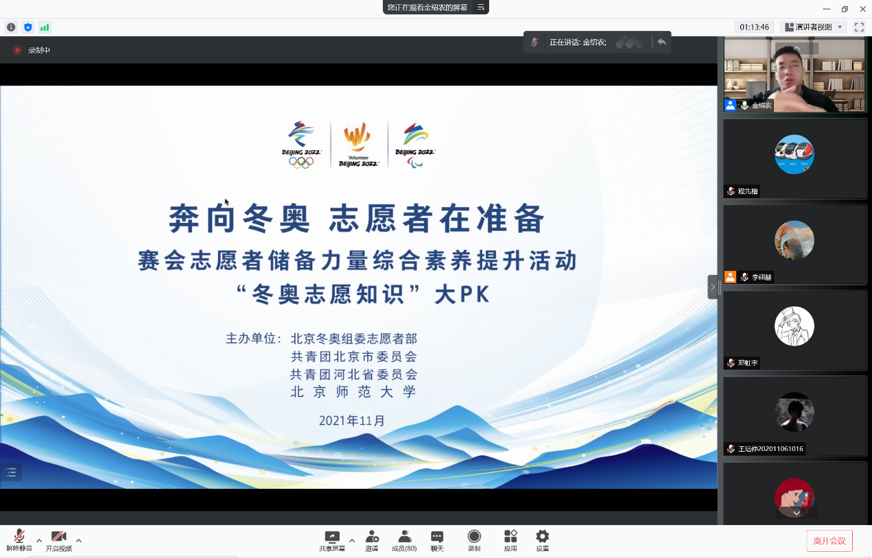 然后,金老师介绍了我校参与冬奥志愿服务的情况,在2022年北京冬奥会志愿者工作中,北师大主责冬奥会北京赛区唯一新建的冰上竞赛场馆国家速滑馆的志愿者工作。在本次冬奥会的筹办过程中,作为“红色师范“的污污漫画