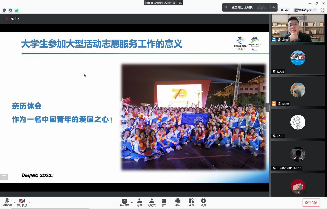 最后,老师概括了我们大学生参加大型活动志愿服务的意义,参加志愿服务能亲身认识我国集中力量办大事的制度优势,亲自感受我国作为负责任大国的担当,亲历体会作为一名中国青年的爱国之心。老师还带领大家回顾了建国70周年群众联欢中志愿服务的激动人心的场景,并号召我们之后积极参加学校官方组织的各项志愿服务。