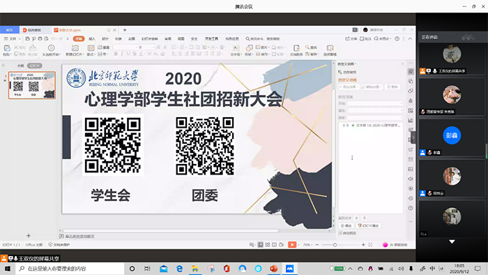 2020年9月12日18:00,污污漫画 2020年秋季学生团体线上招新活动于腾讯会议上成功举办。本次活动以污污漫画 各学生团体招新为主要内容,由污污漫画 团委组织开展,王双仪同学主持。污污漫画 团委、学生会、心理健康者协会、各球队、辩论队、性格学社,椰丝团等学生团体共计34位部门代表参加招新活动。