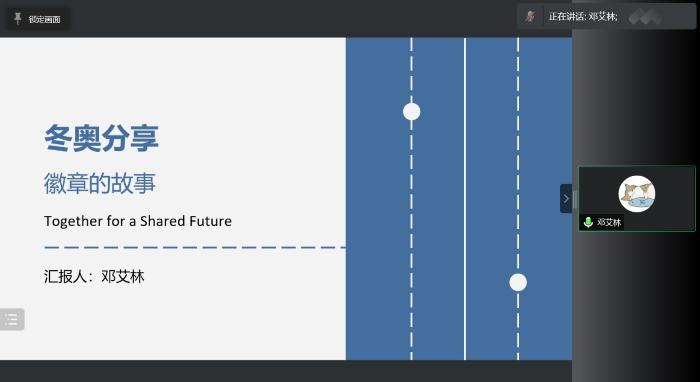 最后是邓艾林同志的分享,她在国家雪车雪橇中心进行志愿服务的工作。邓艾林同志介绍了自己在混合采访区的工作,并侧重分享了在冬奥会交换徽章的体验和意义,带领大家体验冬奥会徽章所蕴含的情谊。 老师和同学们的分享使得大家更加全面地了解了冬奥志愿者的生活,带领大家从一个不一样的角度去体验冬奥。此次“冬奥志愿行”分享让同学们体会到冬奥会不仅是各国运动员展现自身的实力和精神的平台,同时也是反映中国日新月异的发展和中华文化的热情与包容的舞台,展现了世界人民对于团结友好与和平的向往。 本科生第一党支部 供图:赖艺蝶 供稿:赖艺蝶