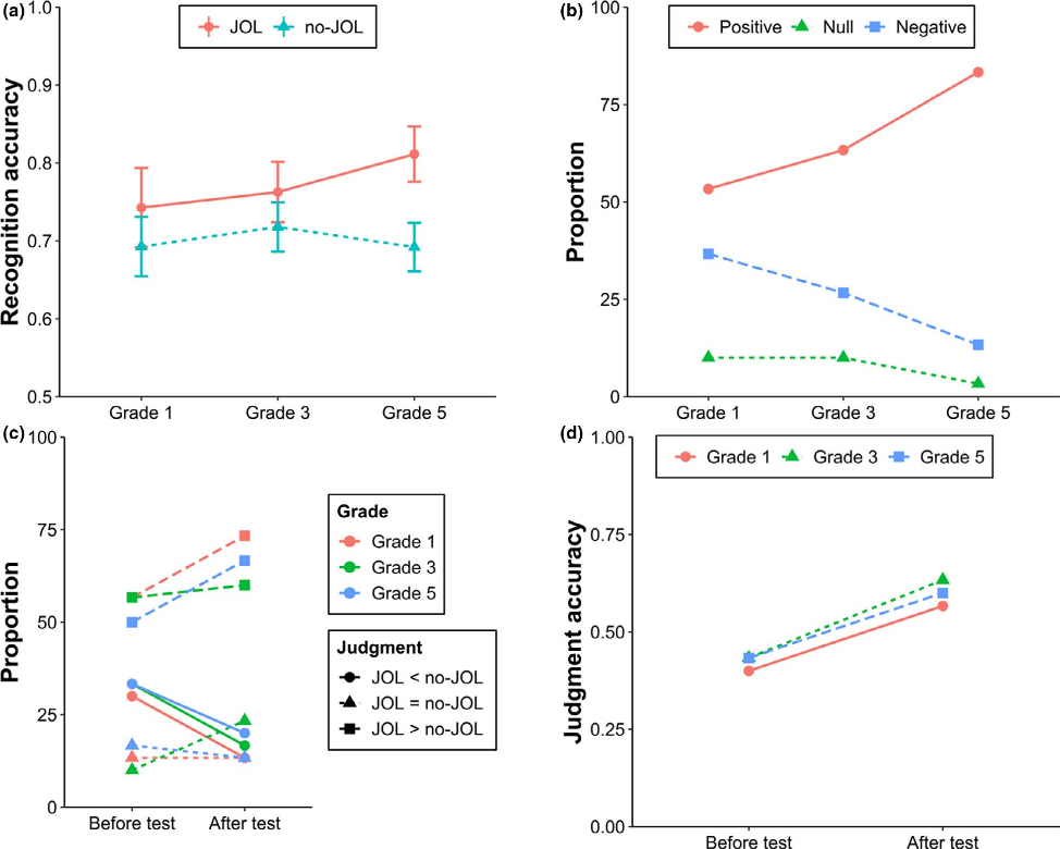 记忆测试的结果表明,三个年级的儿童被试均表现出对于做学习判断的词汇比不做学习判断的词汇记得更好的现象,即表现出反向效应(见下图a)。更为重要的是,相比较于一年级和三年级儿童,五年级儿童表现出了更大的反向效应,表明反向效应随着年龄而逐渐增加。 此外,该研究还考察了儿童是否认能够意识到学习判断对学习成绩的促进作用。结果发现,在记忆测试前,仅部分学生(约50%)认为学习判断能够提高记忆成绩(见下图c)。然而,在完成记忆测试后,约65%学生能够成功意识到学习判断的促进作用(见下图c)。该结果表明,测试体验能够作为一种有效的干预手段,提高儿童对于反向效应的元意识。