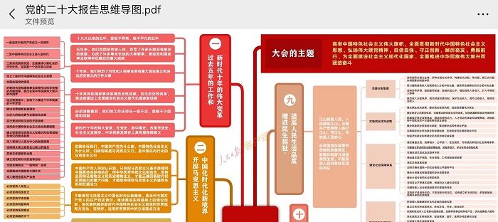 接下来,团支书带领大家一起细读了二十大报告,学习党的二十大精神。在学习了大会主题后,基于一图速览二十大报告展开学习了党的二十大报告的十五个部分。在逐个细致学习后,团支书分享了党的二十大报告思维导图材料,引导同学们自主阅读学习。