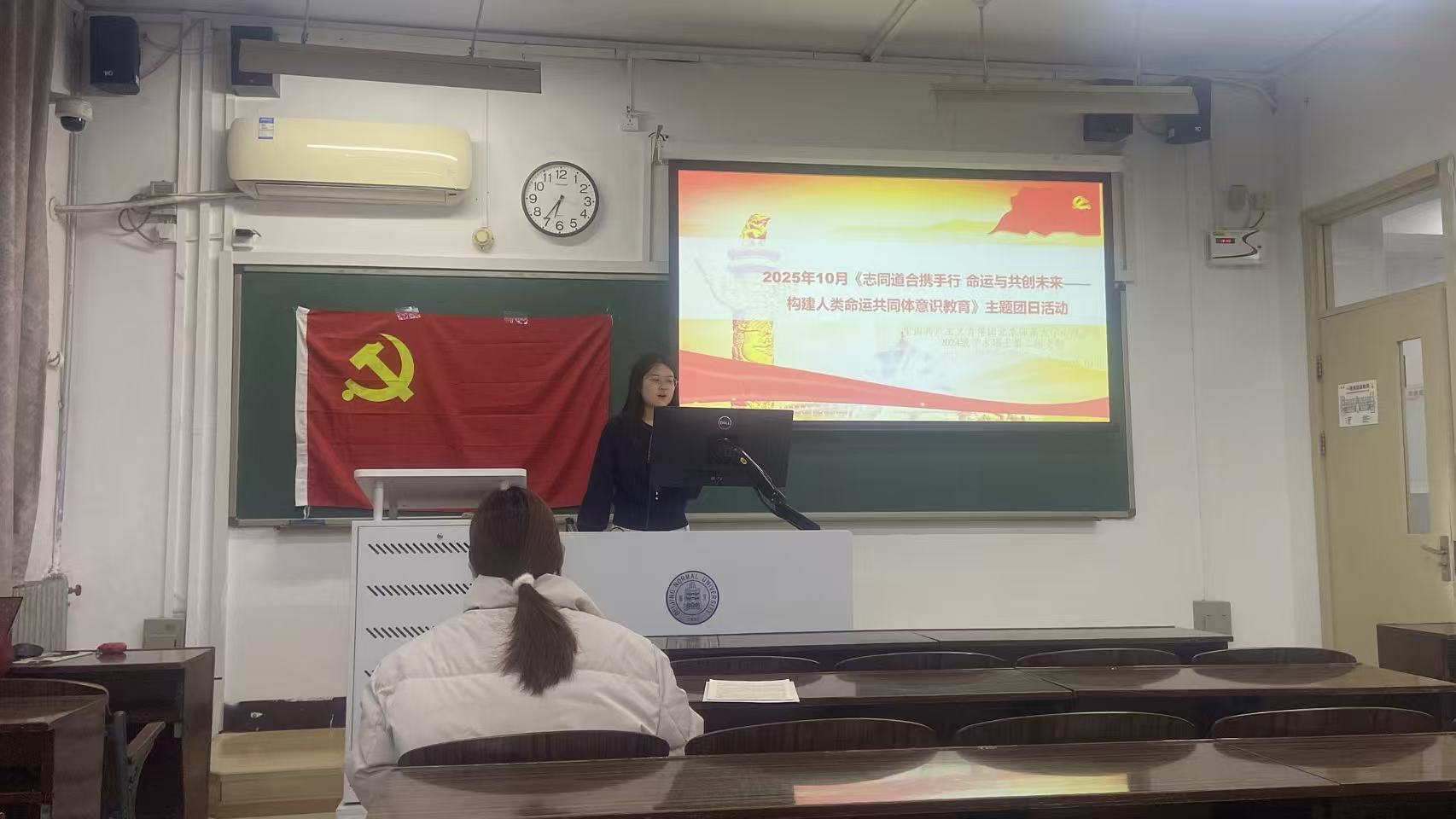 首先开展的是 “志同道合携手行,命运与共创未来——构建人类命运共同体意识教育”主题团日活动,由团支书付晨露同志主持。本次活动主要围绕习近平总书记在《求是》杂志上发表的两篇重要文章展开学习,文章题名分别为《中华民族共同体的形成和发展是人心所向、大势所趋、历史必然》和《推动落实全球发展倡议、全球安全倡议、全球文明倡议、全球治理倡议》。