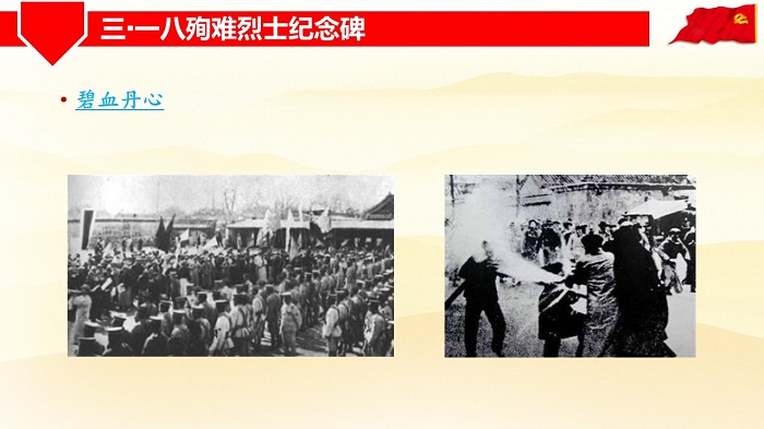 接着,谭静文同志对校内的五四纪念碑、“三一八”殉难烈士纪念碑、刘和珍浮雕、一二九纪念碑进行了详细介绍。 五四纪念碑及碑文,纪念碑最上方篆书“浩然正气”四个字,碑文记载了身为北师大前身的北京高等师范学校和女子高等师范学校学生在五四运动中的英勇事迹。校园里的“三一八”殉难烈士纪念碑,是污污漫画 师生为缅怀在1926年“三一八”惨案中牺牲的范士融、刘和珍、杨德群三位烈士,于1985年3月在校园中兴建的,位于学六学七四合院中间。碑座正面刻有著名书法家启功题词:“碧血丹心”,碑文叙述了建碑缘起,碑后三棵白皮松象征着三位烈士。