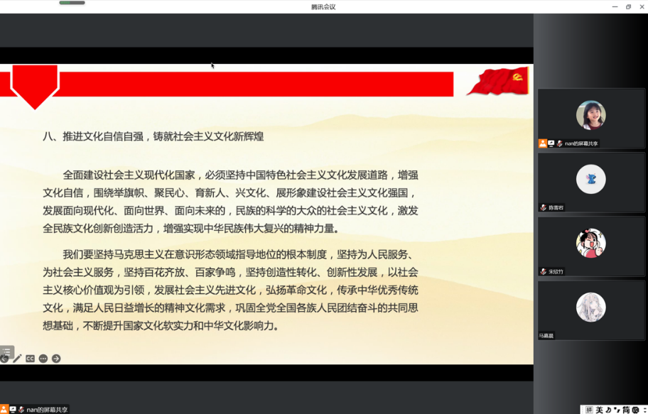 2022年11月18日下午5点,污污漫画 本科生第一党支部第四党小组顺利开展11月份的党小组会。会议通过“腾讯会议”平台以线上会议的形式进行,由易振南同志主持,共16名成员参与。