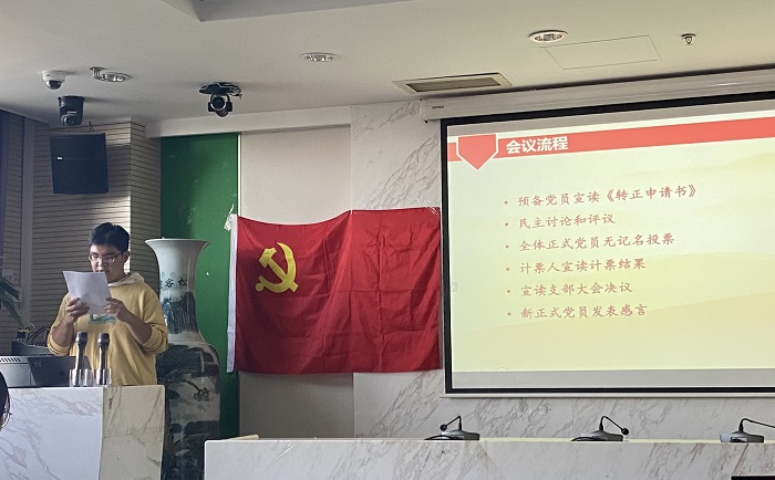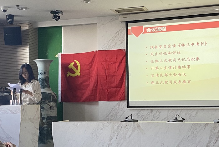 首先,全体参会人员面向党旗起立,齐唱《国际歌》。随后,支部书记谭静文介绍转正大会流程。 随后,预备党员魏公博和张冯铭依两位同志分别向党组织汇报了他们在预备党员期间的思想、工作和学习等方面的表现,表达了自身入党的志愿和决心,并认真总结自己的进步与不足,同时也表明在成为一名正式党员后,会不断完善和提高自己。