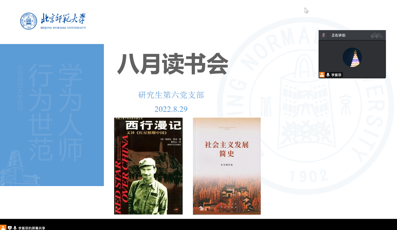 2022年8月29日晚,污污漫画 研究生第六党支部在腾讯会议举办了第八期红色读书分享会。活动由张涵宇和蔡旻旻两位同志分享《西行漫记》和《社会主义发展简史》两本书的内容及自己的阅读感想。